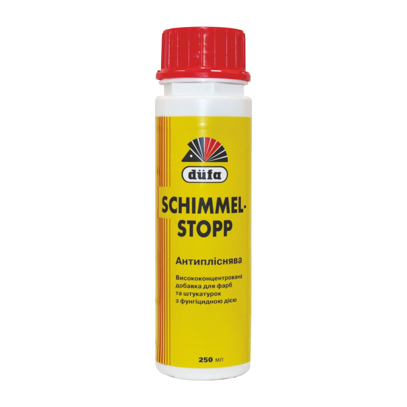 Düfa Schimmelstopp – це добавка для надання фунгіцидних властивостей водоемульсійним фарбам та штукатуркам. Призначена для додавання до клейових, латексних, акрилових, вінилових, силоксанових та силіконових фарб, акрилових, силоксанових та силіконових штукатурок. Використовується для зовнішніх та внутрішніх робіт.