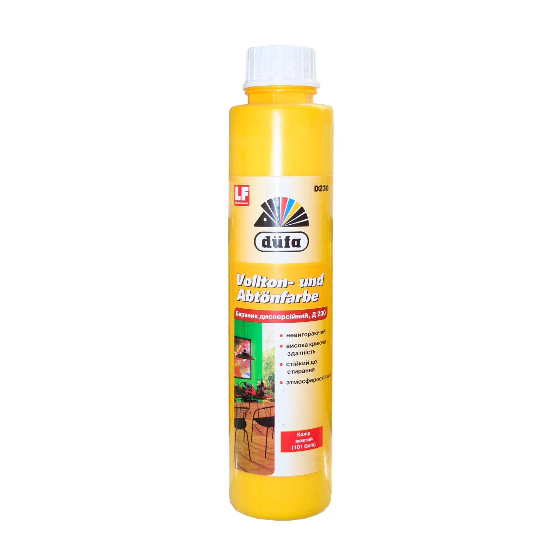 Барвник Dufa D230 призначений для декоративного оздоблення фасадних і внутрішніх поверхонь, а також для колірування білих дисперсійних акрилових, латексних, клейових фарб і синтетичних штукатурок. Всі кольори можна змішувати між собою. Не містить розчинників.