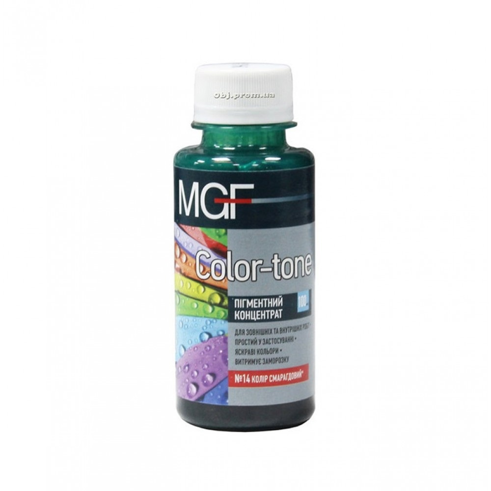 MGF Color-tone - концентрат, що використовується для отримання потрібного відтінку шляхом ручного тонування. Підходить для тонування водно-дисперсійних фарб, масляних, а також алкідних емалей, вапняних розчинів, сухих будівельних сумішей.