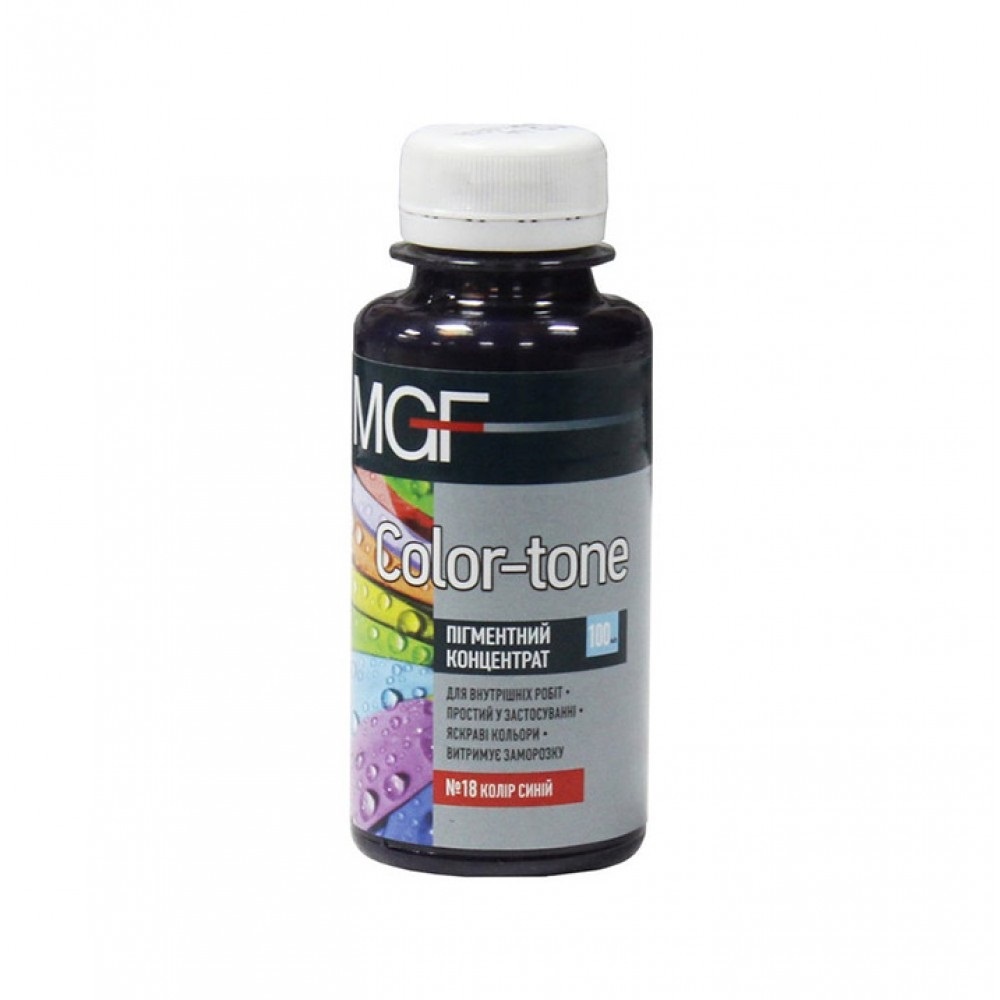 MGF Color-tone - концентрат, що використовується для отримання потрібного відтінку шляхом ручного тонування. Підходить для тонування водно-дисперсійних фарб, масляних, а також алкідних емалей, вапняних розчинів, сухих будівельних сумішей.