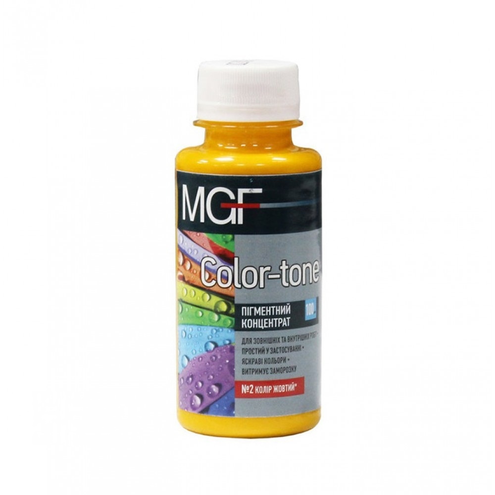 MGF Color-tone - концентрат, що використовується для отримання потрібного відтінку шляхом ручного тонування. Підходить для тонування водно-дисперсійних фарб, масляних, а також алкідних емалей, вапняних розчинів, сухих будівельних сумішей.