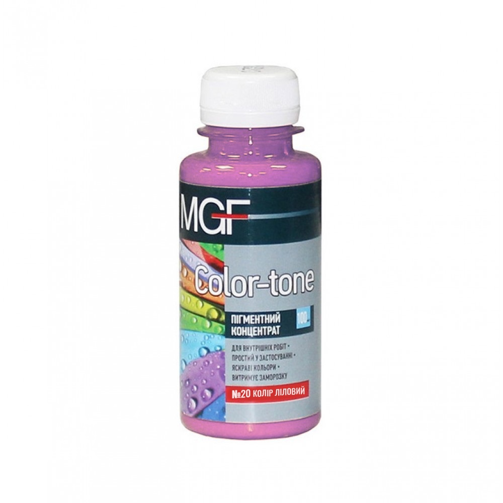 MGF Color-tone - концентрат, що використовується для отримання потрібного відтінку шляхом ручного тонування. Підходить для тонування водно-дисперсійних фарб, масляних, а також алкідних емалей, вапняних розчинів, сухих будівельних сумішей.