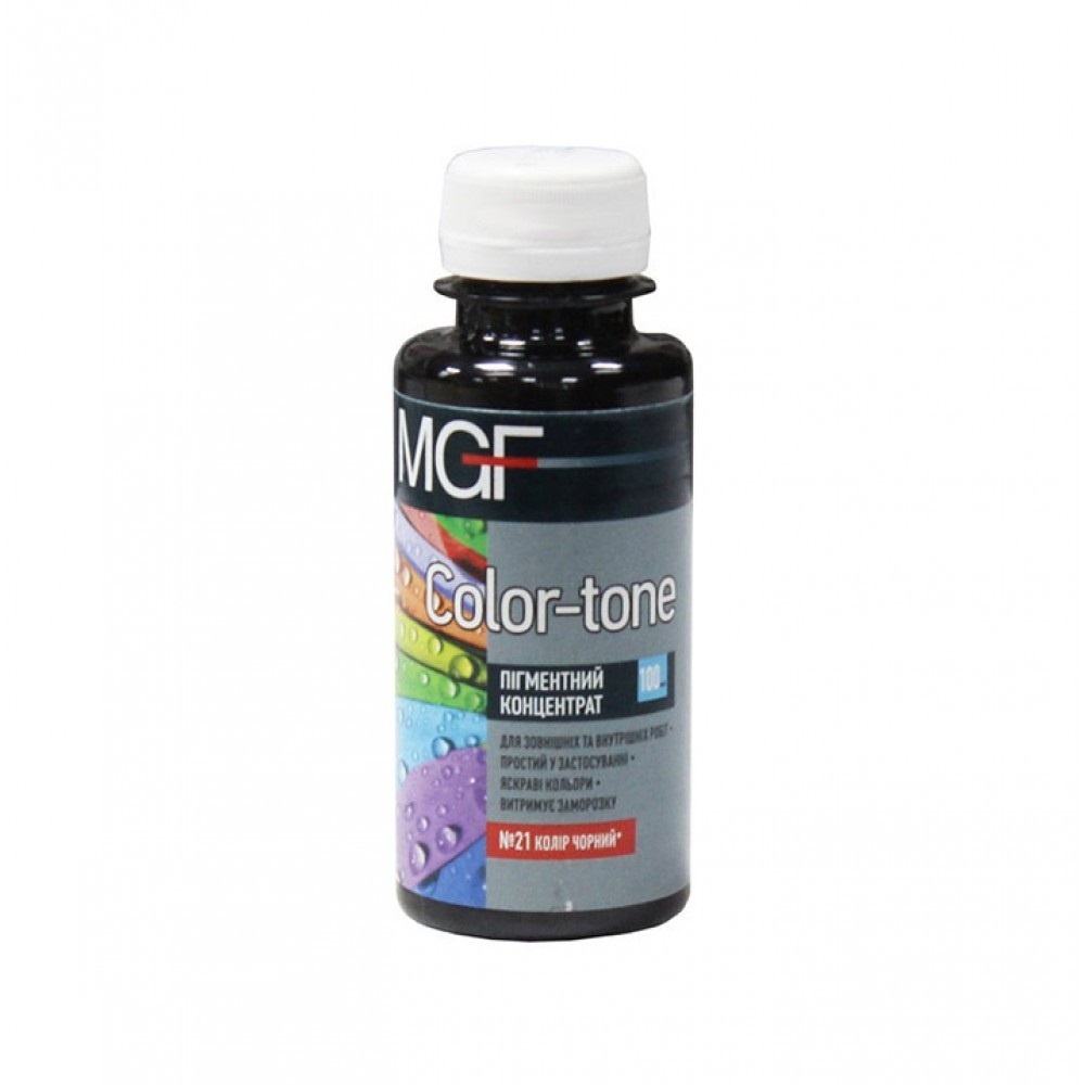 MGF Color-tone - концентрат, що використовується для отримання потрібного відтінку шляхом ручного тонування. Підходить для тонування водно-дисперсійних фарб, масляних, а також алкідних емалей, вапняних розчинів, сухих будівельних сумішей.