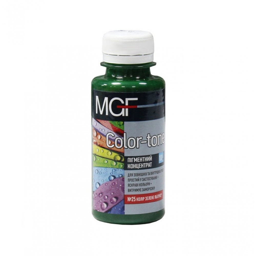MGF Color-tone - концентрат, що використовується для отримання потрібного відтінку шляхом ручного тонування. Підходить для тонування водно-дисперсійних фарб, масляних, а також алкідних емалей, вапняних розчинів, сухих будівельних сумішей.