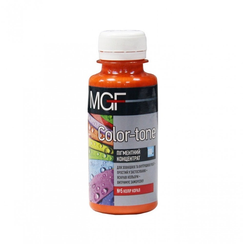 MGF Color-tone - концентрат, що використовується для отримання потрібного відтінку шляхом ручного тонування. Підходить для тонування водно-дисперсійних фарб, масляних, а також алкідних емалей, вапняних розчинів, сухих будівельних сумішей.