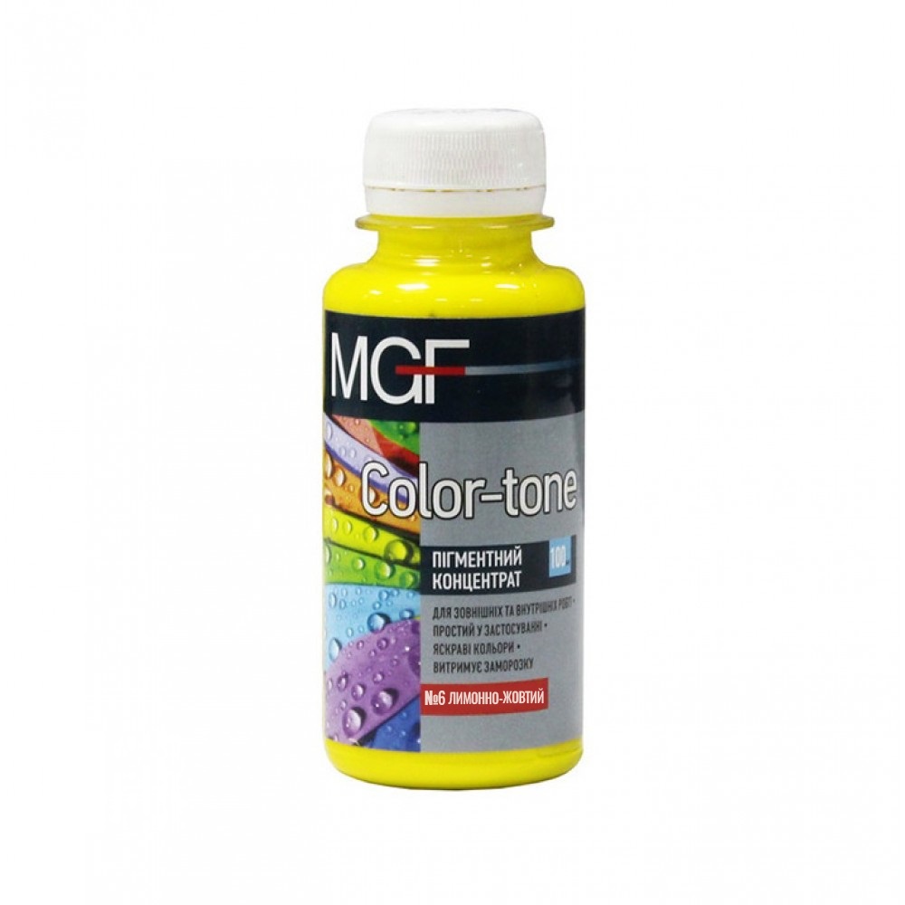 MGF Color-tone - концентрат, що використовується для отримання потрібного відтінку шляхом ручного тонування. Підходить для тонування водно-дисперсійних фарб, масляних, а також алкідних емалей, вапняних розчинів, сухих будівельних сумішей.