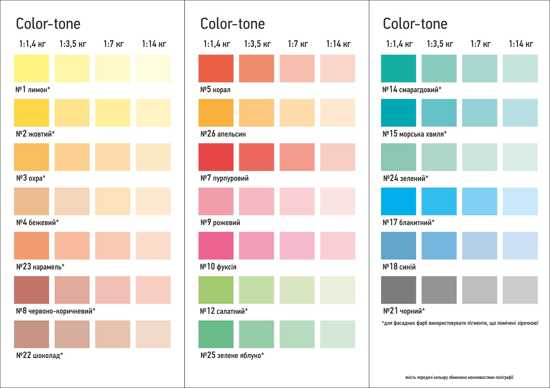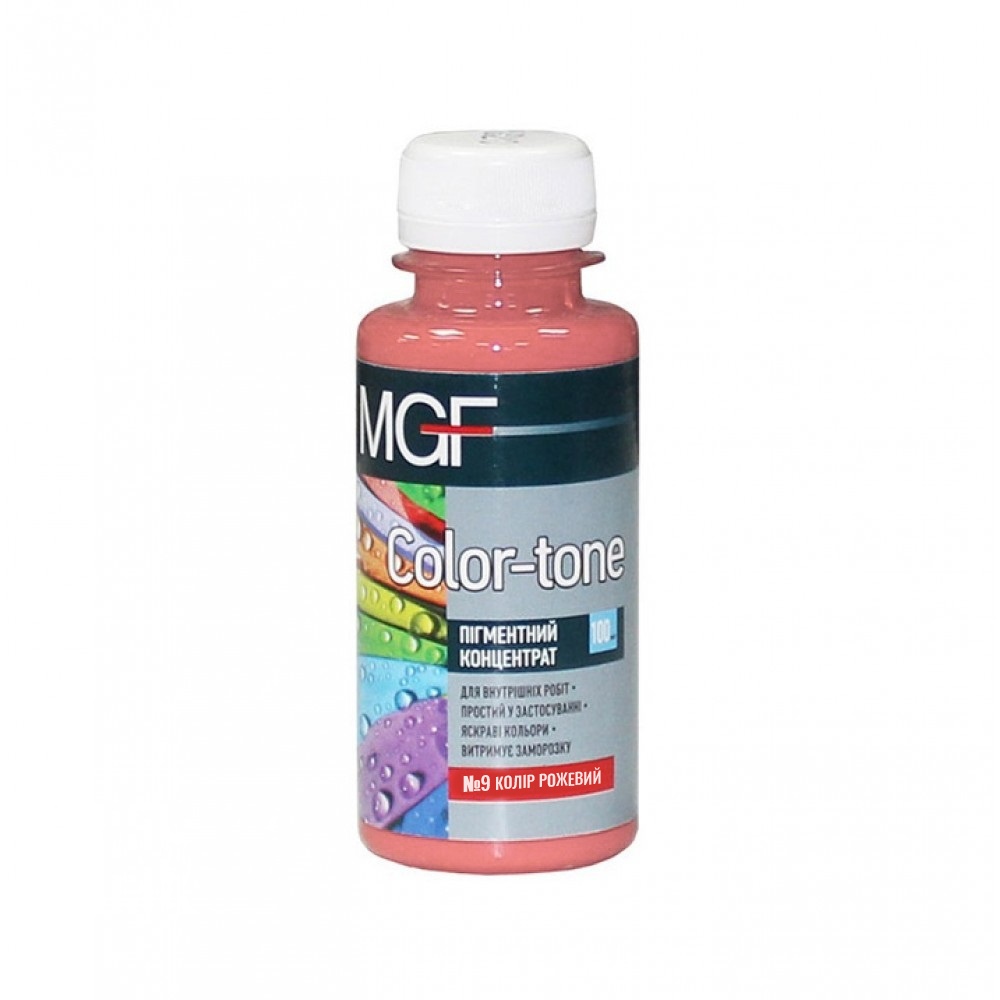 MGF Color-tone - концентрат, що використовується для отримання потрібного відтінку шляхом ручного тонування. Підходить для тонування водно-дисперсійних фарб, масляних, а також алкідних емалей, вапняних розчинів, сухих будівельних сумішей.