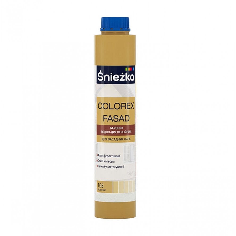 Sniezka Colorex Fasad - це водно-дисперсійний барвник, основою якого є спеціально відібрана смола, яка гарантує повний захист від атмосферних факторів. Високоякісні пігменти, що містяться у виробі, гарантують стійкі та яскраві кольори впродовж тривалого часу.