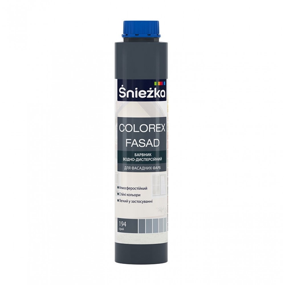Sniezka Colorex Fasad - це водно-дисперсійний барвник, основою якого є спеціально відібрана смола, яка гарантує повний захист від атмосферних факторів. Високоякісні пігменти, що містяться у виробі, гарантують стійкі та яскраві кольори впродовж тривалого часу.