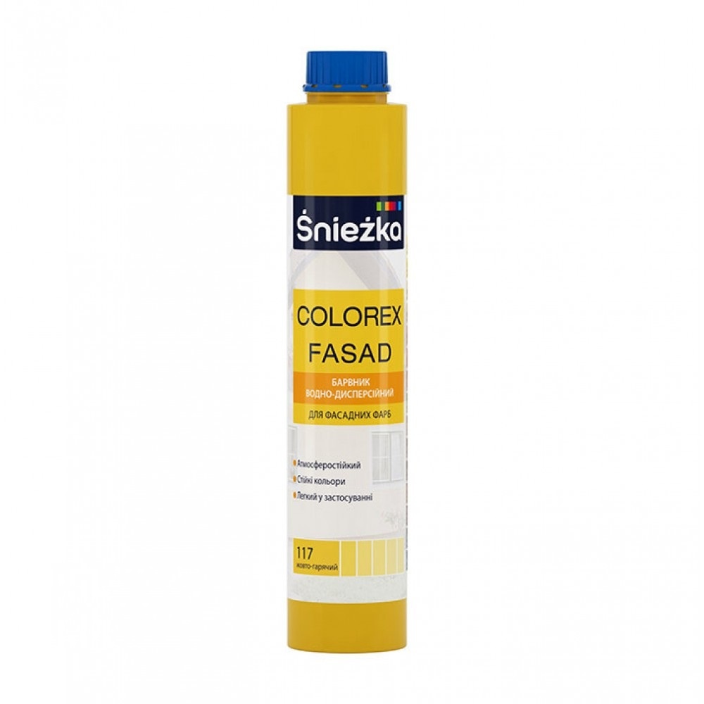 Sniezka Colorex Fasad - це водно-дисперсійний барвник, основою якого є спеціально відібрана смола, яка гарантує повний захист від атмосферних факторів. Високоякісні пігменти, що містяться у виробі, гарантують стійкі та яскраві кольори впродовж тривалого часу.