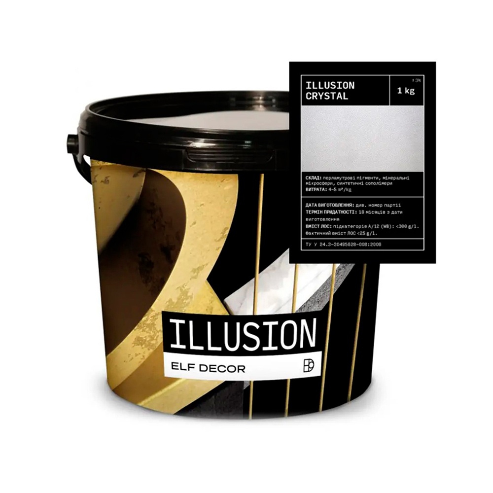 Elf Decor Illusion Crystal – це ультра-іскристе та ультра-трендове перламутрове декоративне покриття. У складі ILLUSION CRYSTAL дрібних скляних частинок, які створюють неповторне сяйво та перелив на поверхні.