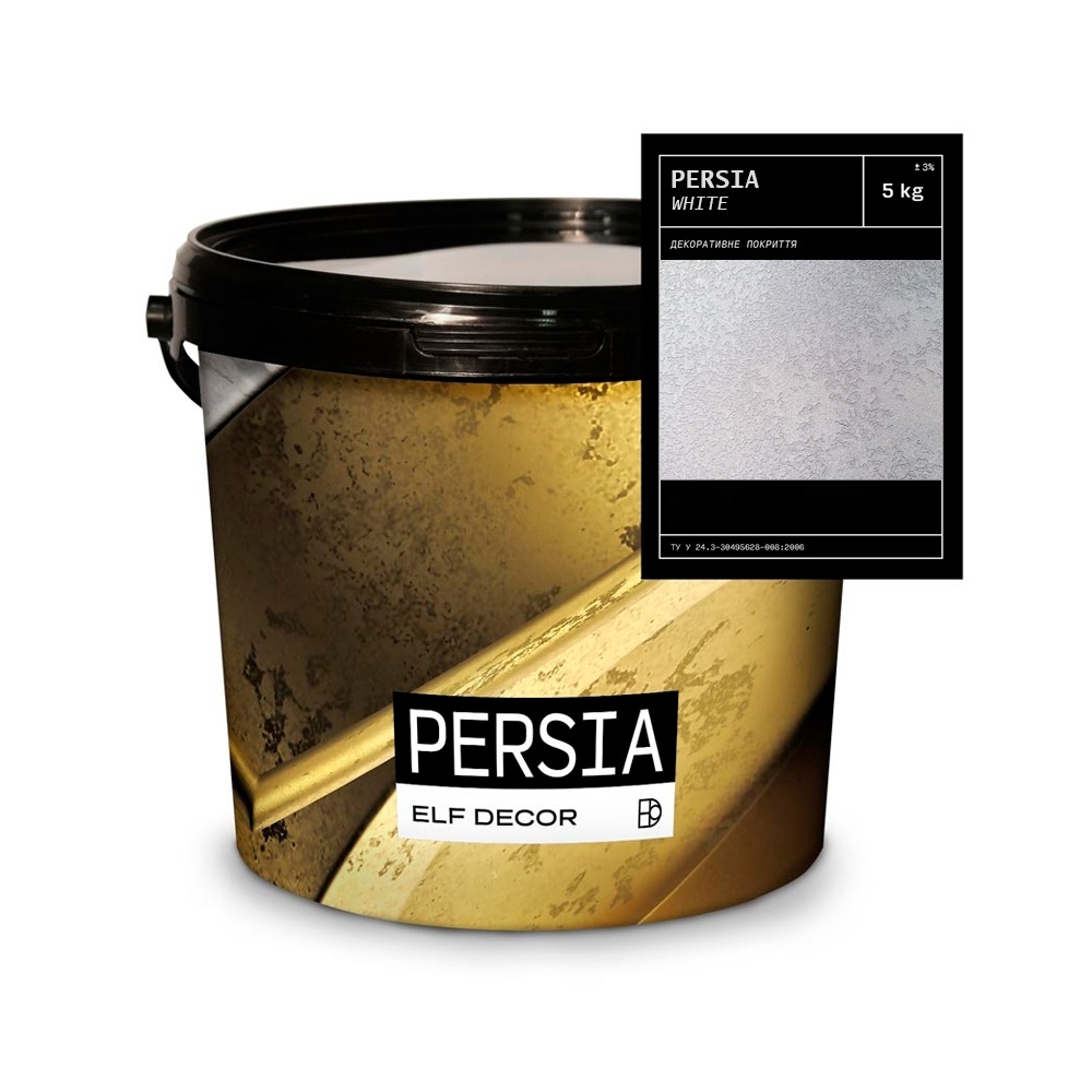 Elf Decor Persia White – це декоративне покриття, що дозволяє створювати різноманітні види фактур для внутрішніх інтер'єрів, застосовуючи різні техніки нанесення. Поєднання дрібних частинок мармуру і перламутрової бази створює надзвичайно святковий, благородний вид.