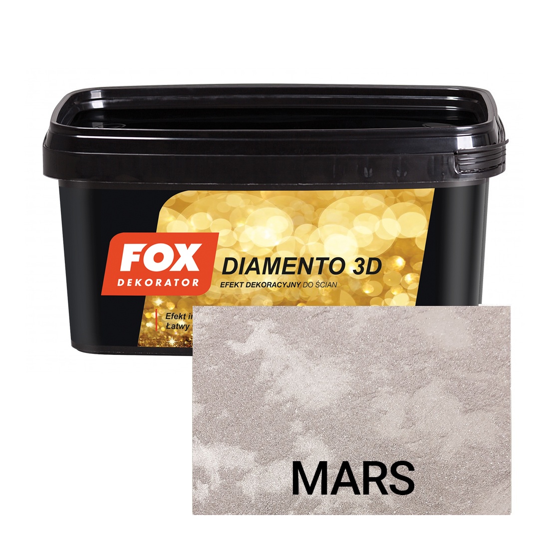 Fox Dekorator Diamento 3D – зручна у використанні декоративна фарба, яка надає пофарбованій поверхні ефект блискучих алмазних частинок. Він надає розписним інтер'єрам риси благородства і краси. Інтер'єри, пофарбовані фарбою DIAMENTO, дозволяють хоч на мить перенестися у світ розкоші.