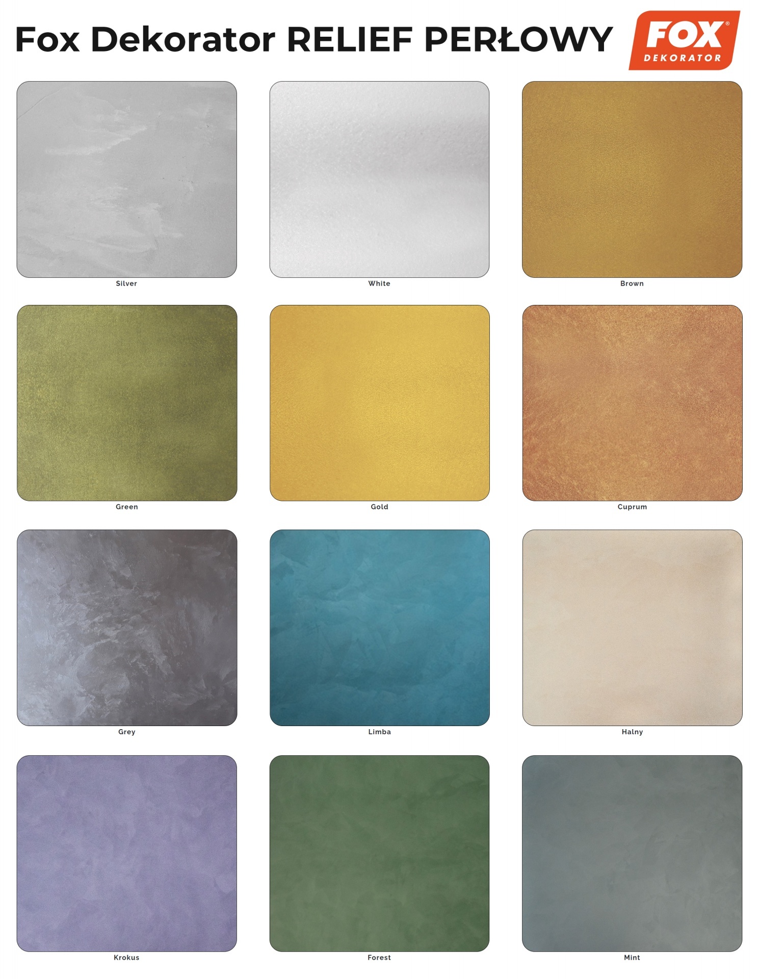 Fox Dekorator Relief Perlowy – проста у використанні напівпрозора структурна фарба для виготовлення тонкошарових декорацій, що надає пофарбованій поверхні ефект перламутрової глибини з взаємопроникаючими шарами.