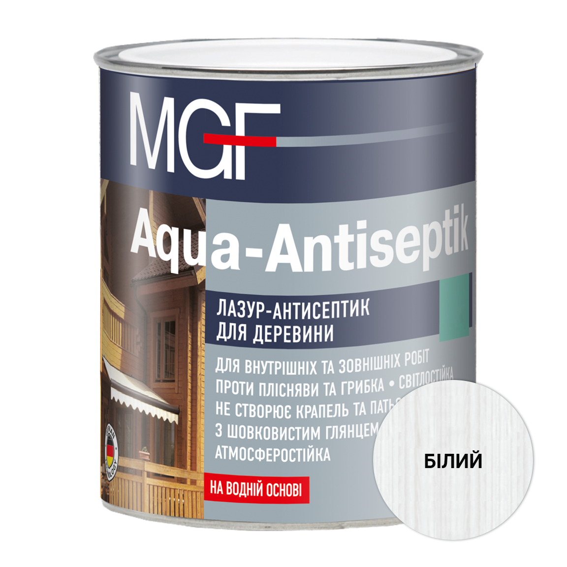 MGF Aqua-Antiseptik - це матеріал на водній основі призначений для декоративної обробки та захисту поверхонь, виготовлених з будь-якої деревини. Використовується на дерев'яних фасадах, зрубах, парканах та альтанках, для дверей та віконних рам, а також інших конструкцій з дерева, фанери, та похідних матеріалів. Не призначений для саун та підлогових покриттів. Підкреслює природну текстуру деревини та утворює довговічне декоративне захисне покриття. Розбавляється водою. Має атмосферостійкі, брудовідштовхуючі властивості, не утворює крапель і потьоків. Захищає від плісняви, грибків та моху.