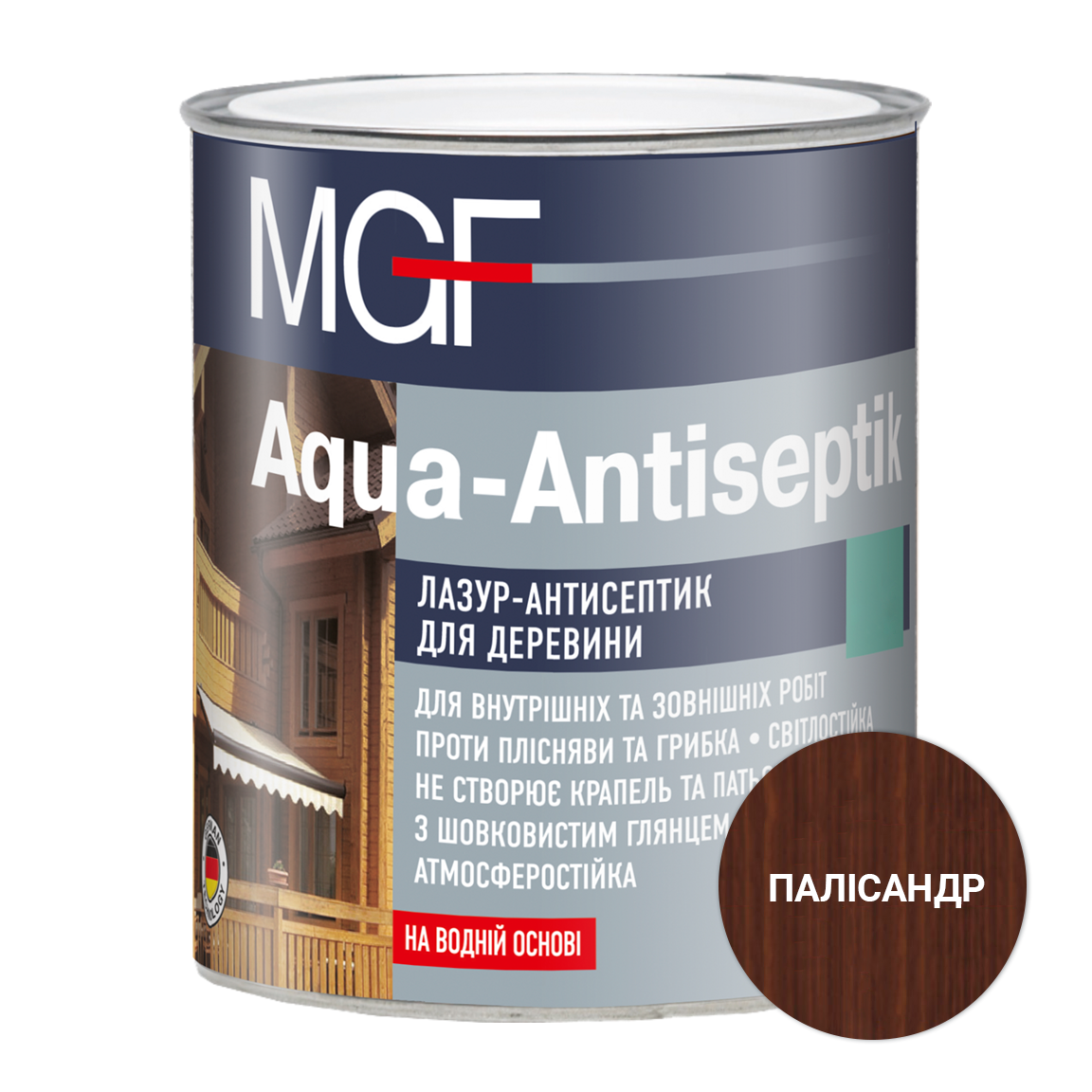 MGF Aqua-Antiseptik - це матеріал на водній основі призначений для декоративної обробки та захисту поверхонь, виготовлених з будь-якої деревини. Використовується на дерев'яних фасадах, зрубах, парканах та альтанках, для дверей та віконних рам, а також інших конструкцій з дерева, фанери, та похідних матеріалів. Не призначений для саун та підлогових покриттів. Підкреслює природну текстуру деревини та утворює довговічне декоративне захисне покриття. Розбавляється водою. Має атмосферостійкі, брудовідштовхуючі властивості, не утворює крапель і потьоків. Захищає від плісняви, грибків та моху.