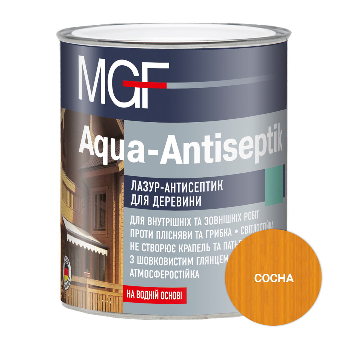 MGF Aqua-Antiseptik - це матеріал на водній основі призначений для декоративної обробки та захисту поверхонь, виготовлених з будь-якої деревини. Використовується на дерев'яних фасадах, зрубах, парканах та альтанках, для дверей та віконних рам, а також інших конструкцій з дерева, фанери, та похідних матеріалів. Не призначений для саун та підлогових покриттів. Підкреслює природну текстуру деревини та утворює довговічне декоративне захисне покриття. Розбавляється водою. Має атмосферостійкі, брудовідштовхуючі властивості, не утворює крапель і потьоків. Захищає від плісняви, грибків та моху.