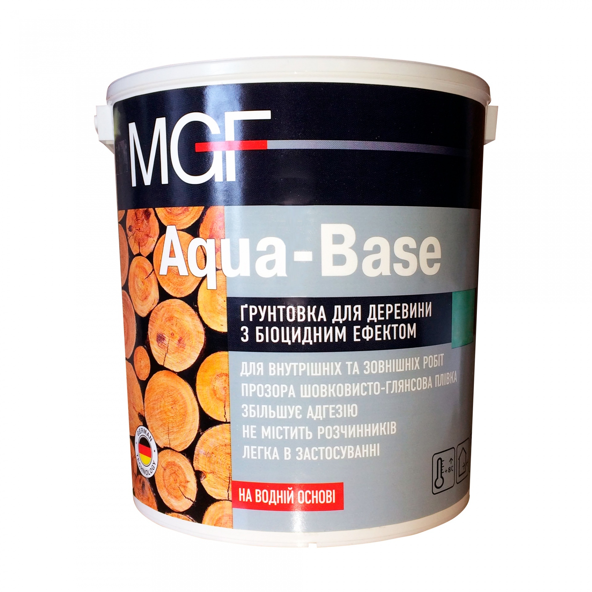 MGF Aqua-Base – це акрилова ґрунтовка для деревини на водній основі. Застосовується для виконання внутрішніх та зовнішніх робіт. Призначена для збільшення адгезії лазурей та лаків на водній основі, зменшення витрати на наступний шар покриття та запобігання біологічному ураженню деревини. Використовується для тимчасового (на кілька місяців) захисту дерев’яних конструкцій від впливу вологи та біологічних пошкоджень на час проведення будівельних робіт. Прозора після висихання.