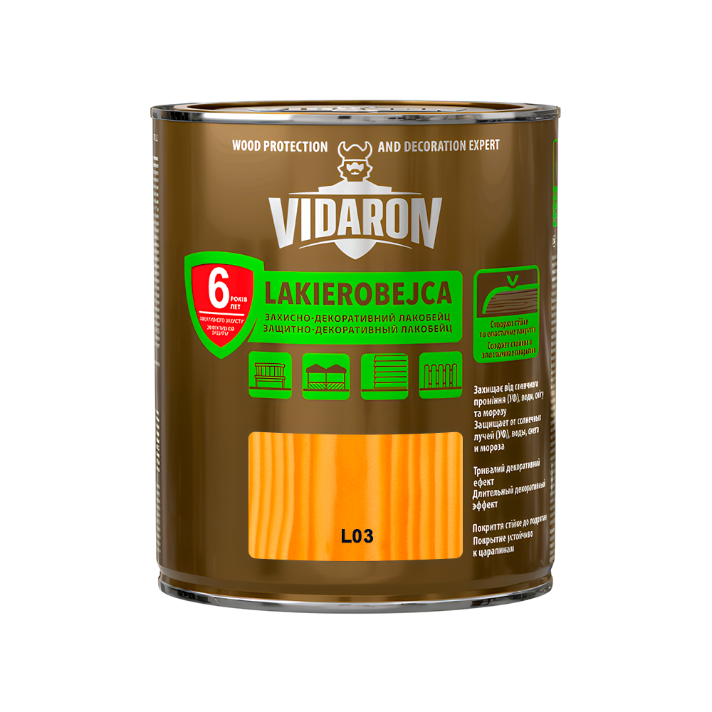 Sniezka Vidaron Лакобейц з додаванням Teflon™ surface protector створює на деревині міцне та еластичне покриття, стійке до стирання. Ефективно захищає деревину від впливу сонячного проміння, води, снігу і морозу, водночас зберігаючи натуральний малюнок її шарів. Використовується для декоративно-захисного фарбування дерев'яних поверхонь, деревопохідних матеріалів, які експлуатуються всередині і назовні будинків - альтанки, дерев'яні елементи фасаду, садові меблі, огорожі. У поєднанні з Імпрегнат-ґрунтом Vidaron забезпечує повний захист деревини.