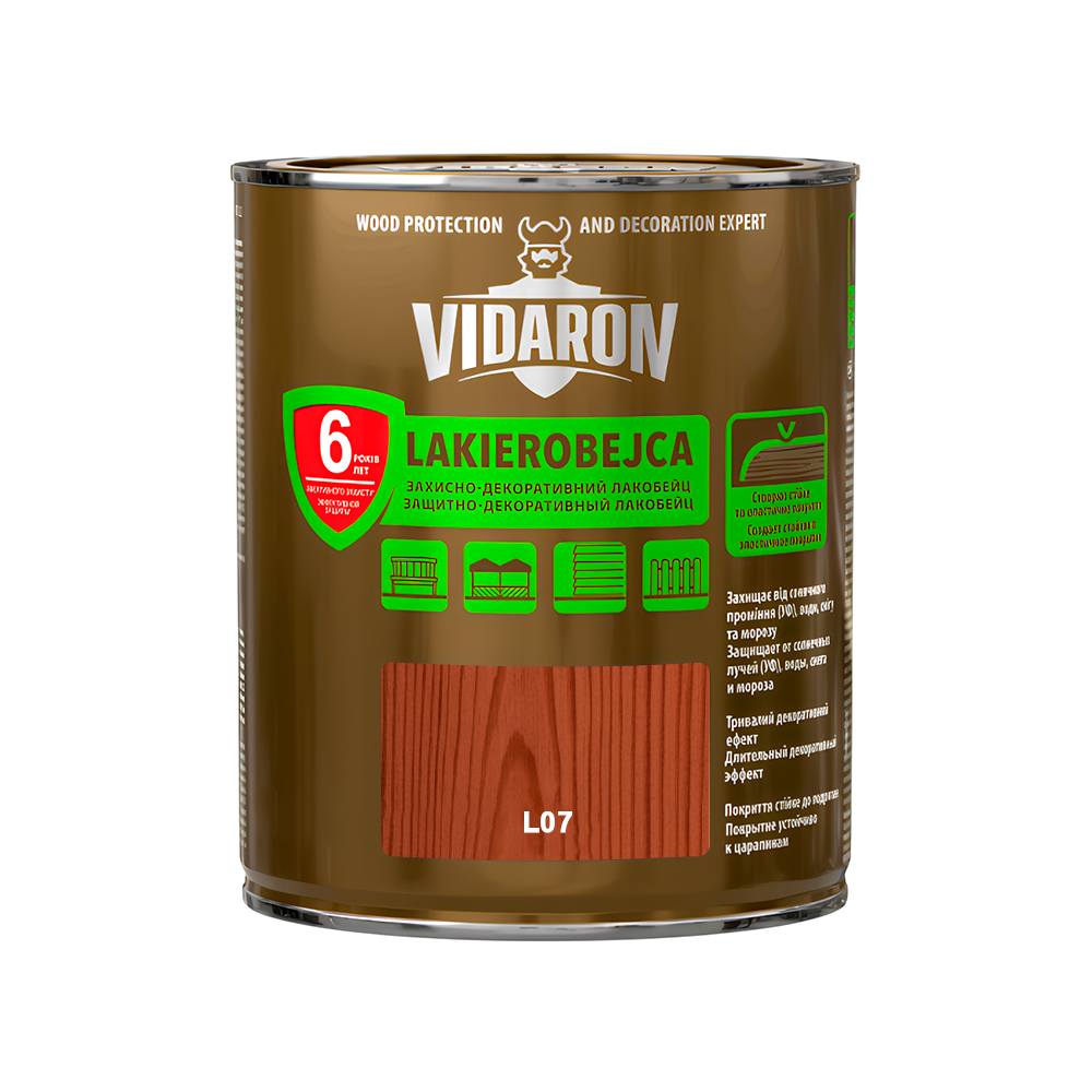 Sniezka Vidaron Лакобейц з додаванням Teflon™ surface protector створює на деревині міцне та еластичне покриття, стійке до стирання. Ефективно захищає деревину від впливу сонячного проміння, води, снігу і морозу, водночас зберігаючи натуральний малюнок її шарів. Використовується для декоративно-захисного фарбування дерев'яних поверхонь, деревопохідних матеріалів, які експлуатуються всередині і назовні будинків - альтанки, дерев'яні елементи фасаду, садові меблі, огорожі. У поєднанні з Імпрегнат-ґрунтом Vidaron забезпечує повний захист деревини.