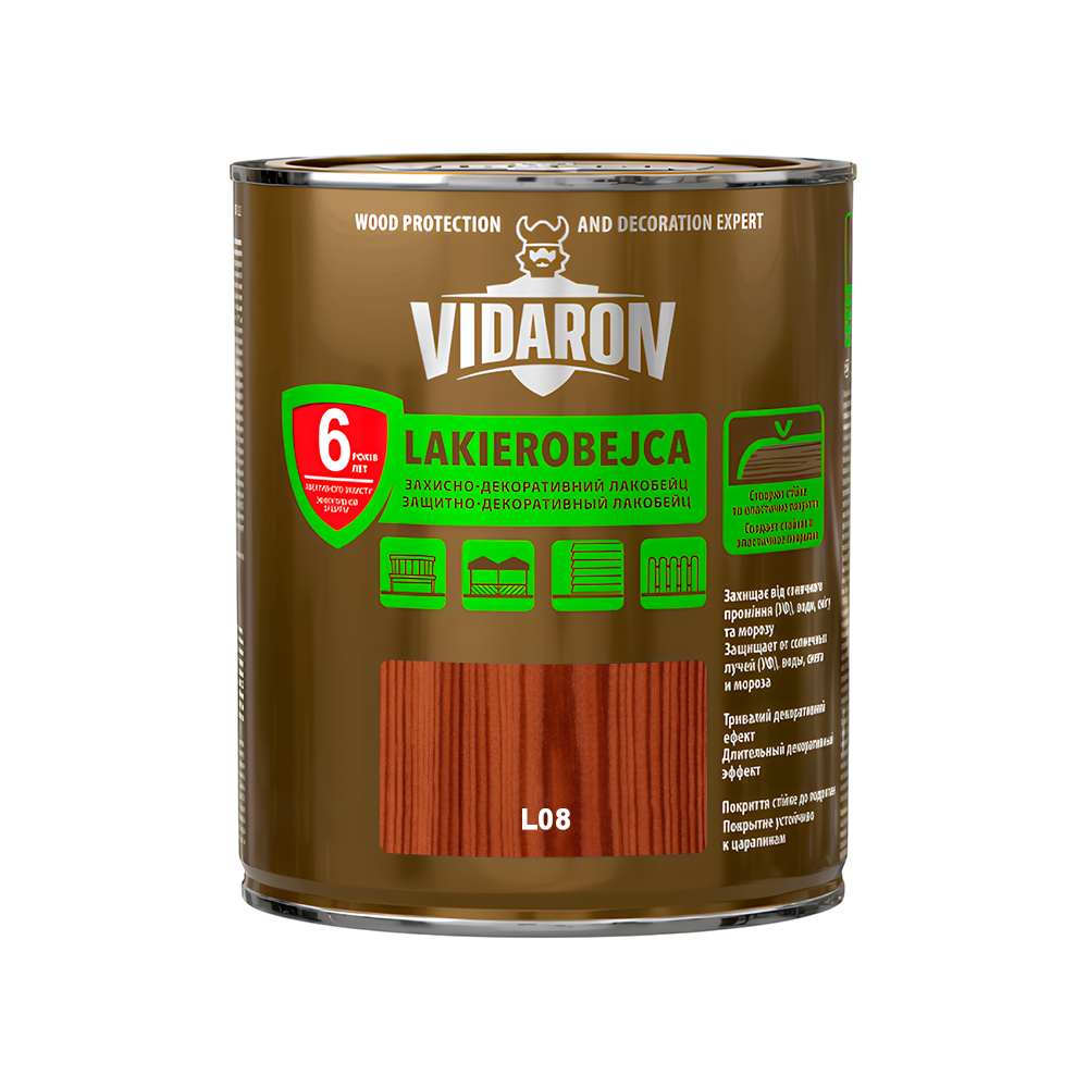 Sniezka Vidaron Лакобейц з додаванням Teflon™ surface protector створює на деревині міцне та еластичне покриття, стійке до стирання. Ефективно захищає деревину від впливу сонячного проміння, води, снігу і морозу, водночас зберігаючи натуральний малюнок її шарів. Використовується для декоративно-захисного фарбування дерев'яних поверхонь, деревопохідних матеріалів, які експлуатуються всередині і назовні будинків - альтанки, дерев'яні елементи фасаду, садові меблі, огорожі. У поєднанні з Імпрегнат-ґрунтом Vidaron забезпечує повний захист деревини.