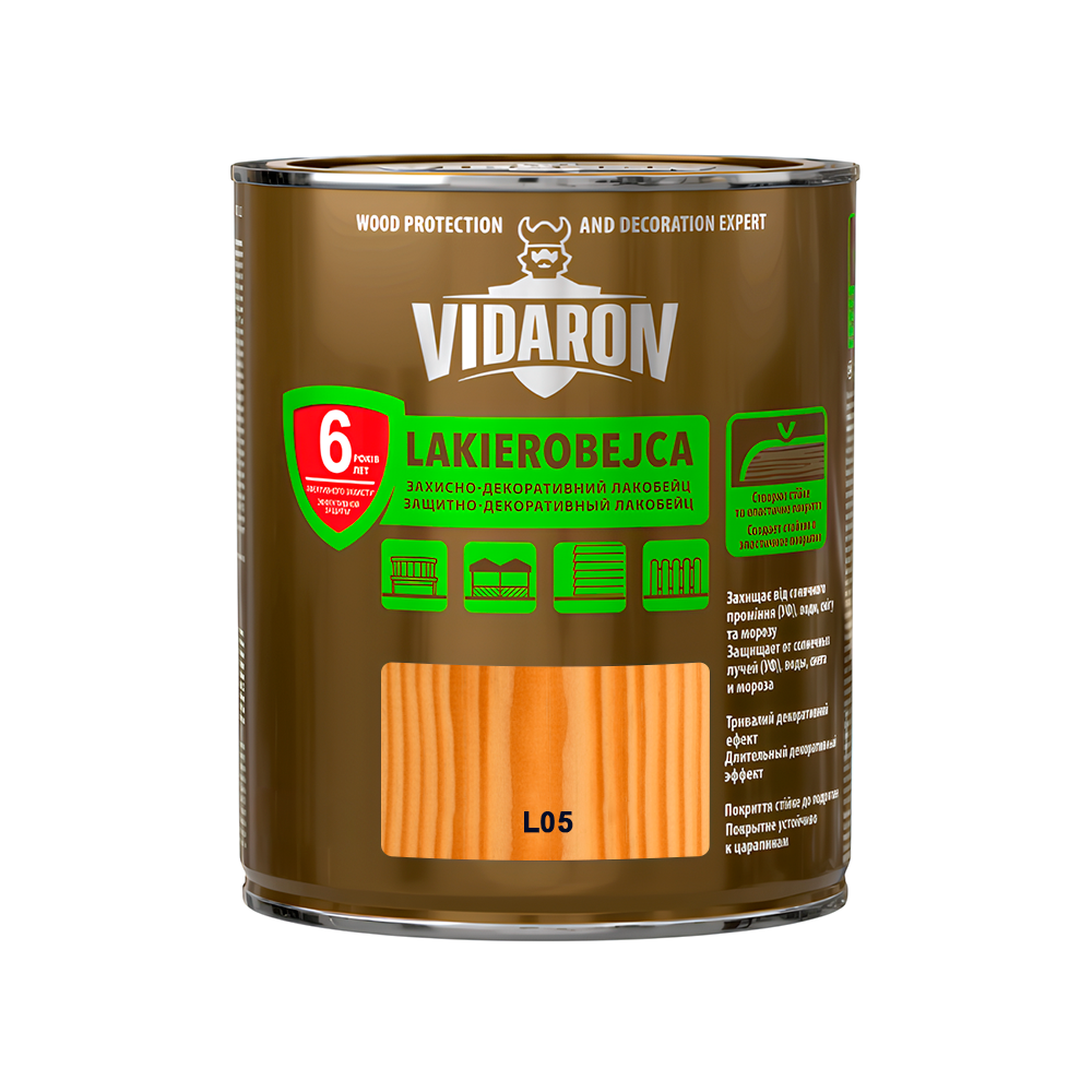 Sniezka Vidaron Лакобейц з додаванням Teflon™ surface protector створює на деревині міцне та еластичне покриття, стійке до стирання. Ефективно захищає деревину від впливу сонячного проміння, води, снігу і морозу, водночас зберігаючи натуральний малюнок її шарів. Використовується для декоративно-захисного фарбування дерев'яних поверхонь, деревопохідних матеріалів, які експлуатуються всередині і назовні будинків - альтанки, дерев'яні елементи фасаду, садові меблі, огорожі. У поєднанні з Імпрегнат-ґрунтом Vidaron забезпечує повний захист деревини.