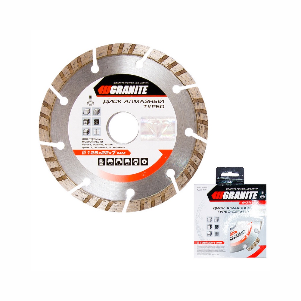 Алмазний диск "Granite" призначений для сухого різання будівельних матеріалів, таких як бетон, цегла, камінь, граніт, вогнетривкий матеріал. Використовується на УШМ, ручному електричному плиткорізі, штроборізі, тощо. Складається з алмазних сегментів і сталевого корпусу. Має унікальну функцію самозаточування