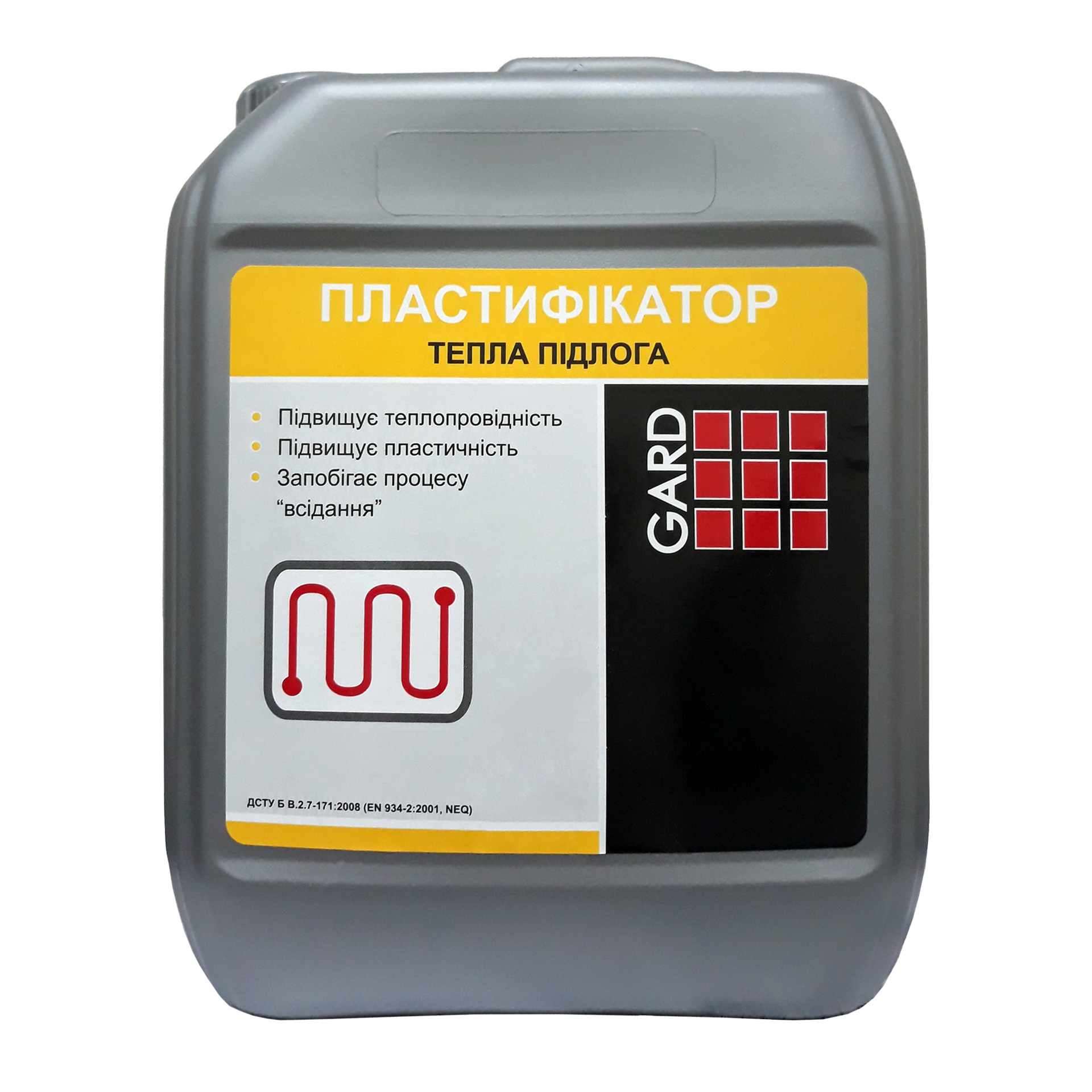 Пластифікатор GARD Тепла підлога - це універсальна добавка, що без зміни консистенції продукує зниження вмісту води замісу до 15% та виводить з бетонного розчину бульбашки повітря. Призначений для регулювання властивостей всіх готових до використання видів бетону (армованого та неармованого), розчинових сумішей та сухих будівельних сумішей. Використовується для улаштування стяжок, наливних та самовирівнюючих підлог, в тому числі і для систем з підігрівом, а також для монолітного будівництва та інших бетонних конструкцій.