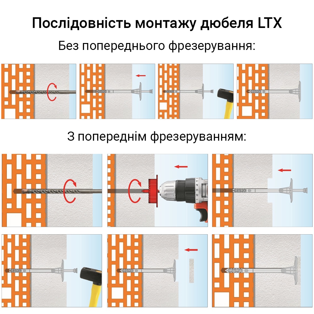 - при виборі довжини дюбеля слід брати до уваги товщину прикріплюваного ізоляційного шару (ізоляційний матеріал + клейова маса), а також мінімальну глибину закладення
