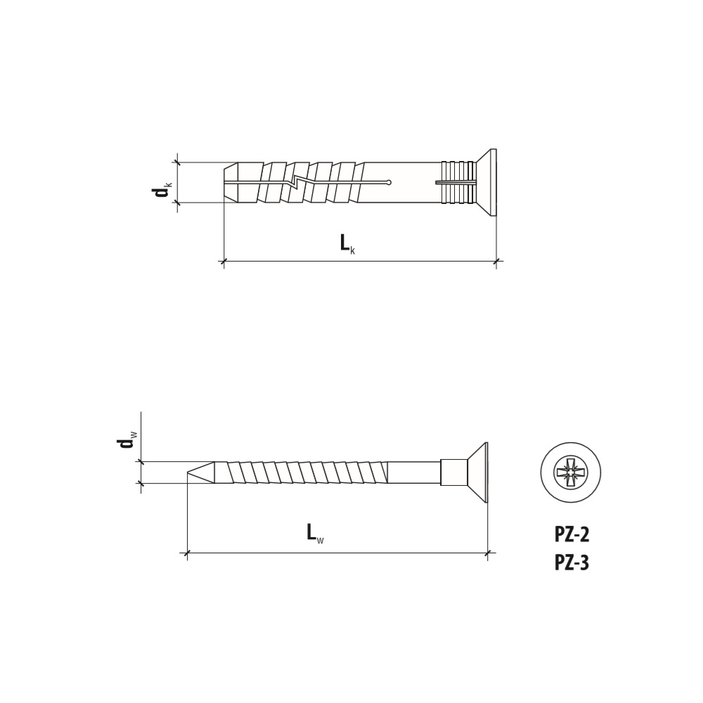 Універсальний дюбель, призначений для швидкого монтажу дерев'яних рам, брусків, дерев'яних конструкцій, планок з PCV, пластмасових лотків, для легких кріплень і електромонтажу (стяжки для кабелю, затискачі) в повнотілих основах.