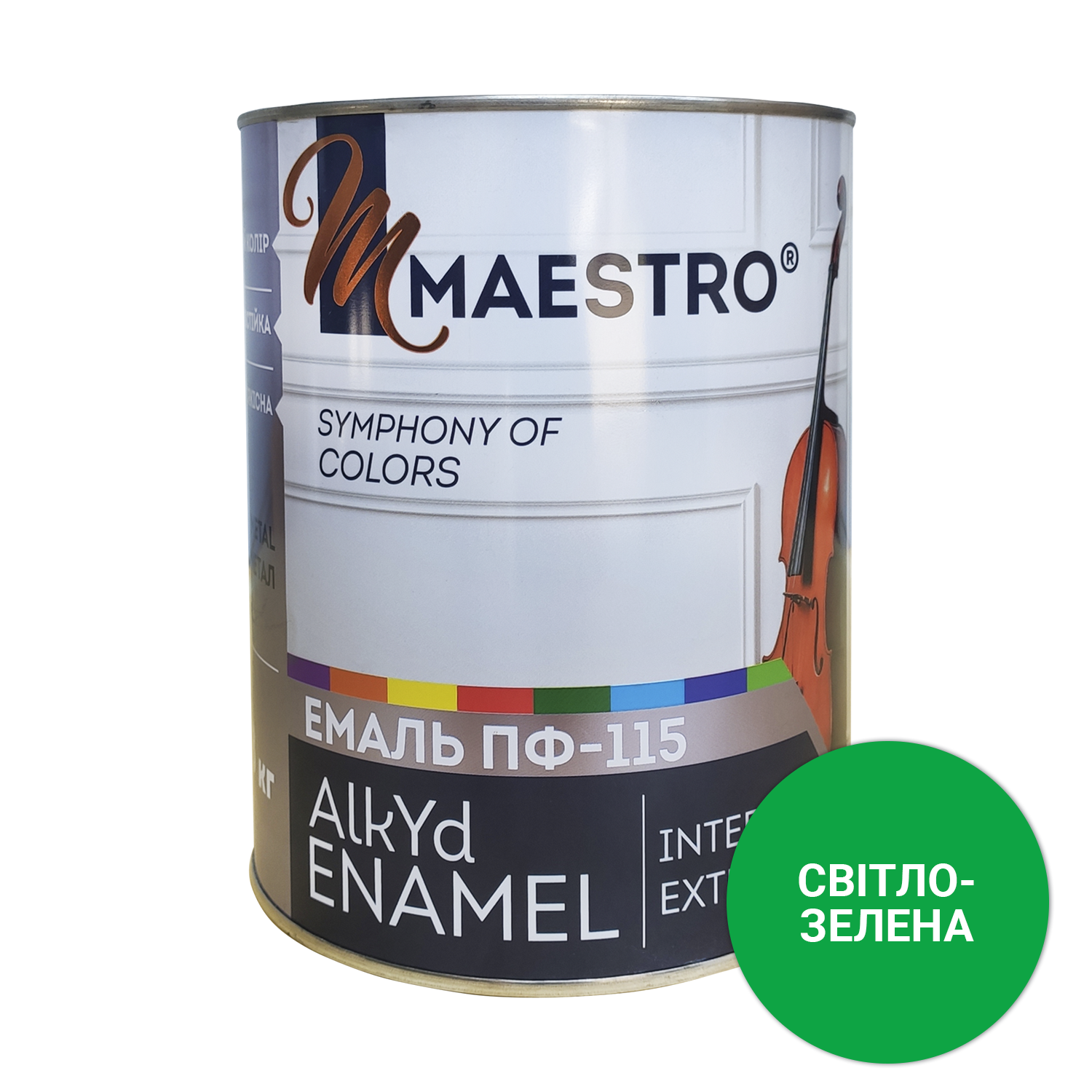 Maestro ПФ-115 – це алкідна емаль, яка добре зарекомендувала себе для фарбування металевих і дерев'яних поверхонь, експлуатованих в атмосферних умовах зовні і всередині приміщень. Матеріал утворює покриття з високими декоративними і захисними властивостями, стійке до перепаду температур від -40°С до +60°С.