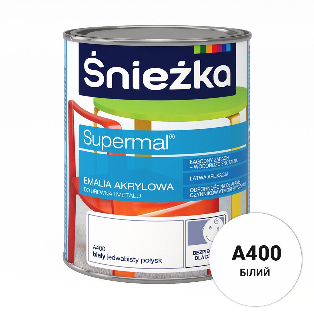 Емаль Sniezka Supermal - це акрилова водорозчинна емаль, призначена для декоративного й захисного фарбування деревини, деревопохідних матеріалів, металевих елементів, цементних основ і штукатурок усередині й назовні приміщень. Можна застосовувати для фарбування іграшок або елементів устаткування ігрових майданчиків, як-от: гойдалки, гірки, каруселі. Її можна також використовувати для відновлення старих покриттів розчинникових фарб.