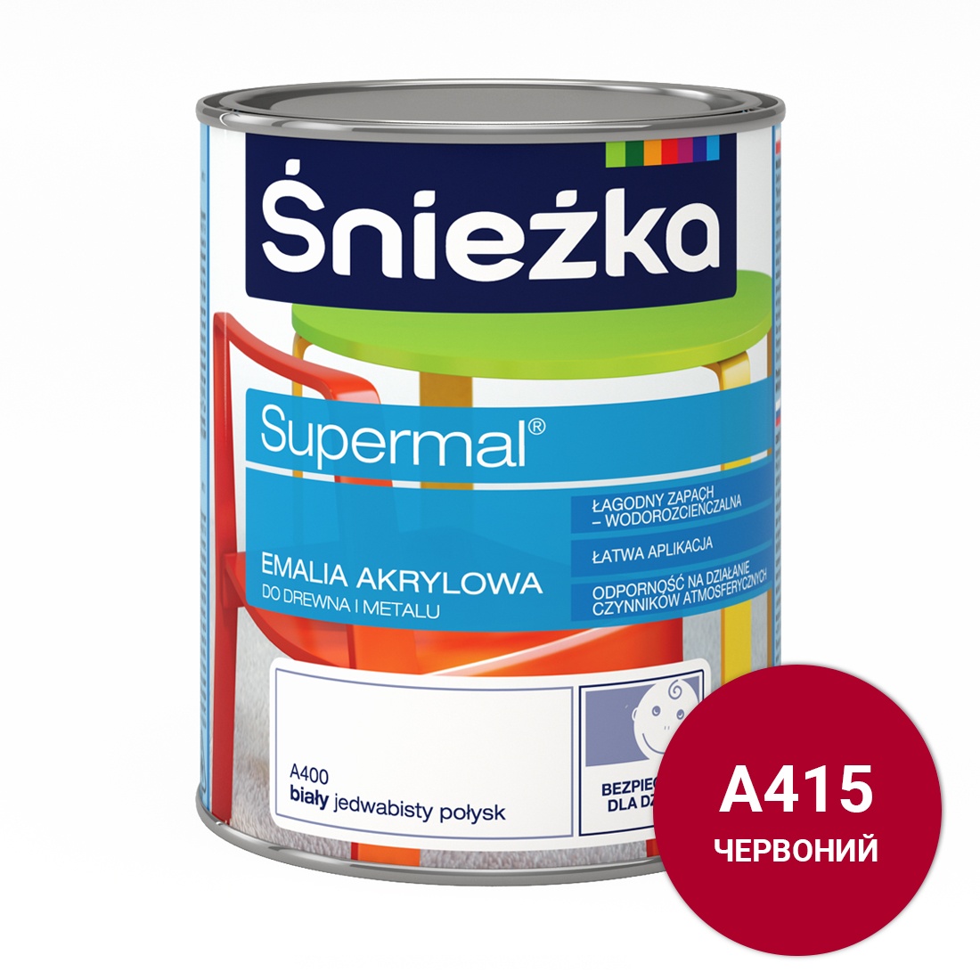 Емаль Sniezka Supermal - це акрилова водорозчинна емаль, призначена для декоративного й захисного фарбування деревини, деревопохідних матеріалів, металевих елементів, цементних основ і штукатурок усередині й назовні приміщень. Можна застосовувати для фарбування іграшок або елементів устаткування ігрових майданчиків, як-от: гойдалки, гірки, каруселі. Її можна також використовувати для відновлення старих покриттів розчинникових фарб.