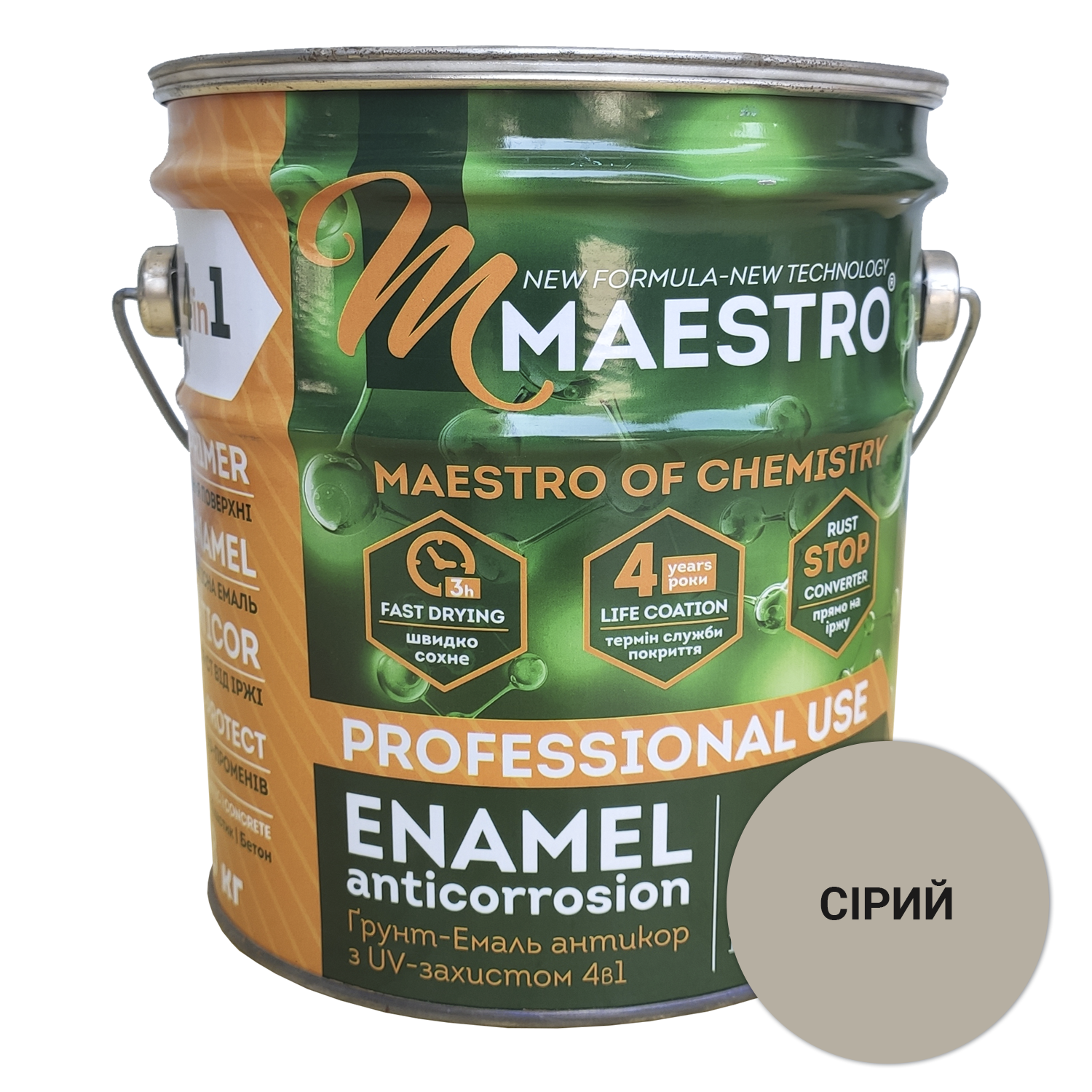 Ґрунт-емаль «Maestro» 4 в 1 - швидковисихаюча ґрунт-емаль по іржі, що об'єднує властивості ґрунту, антикорозійного покриття, декоративної емалі і захисного лаку. Завдяки цьому значно скорочує час, який зазвичай потрібно для проведення кожної процедури окремо (видалення іржі, ґрунтування та фарбування).Володіє хорошим зчепленням з поверхнею, що фарбується навіть при нанесенні на іржу. Утворює міцне покриття з довготривалим захистом від корозії, високими декоративними властивостями і стійкістю до механічних і атмосферних впливів. Не вигорає під дією УФ-променів, не тріскається і не відшаровується, зберігає еластичність навіть при негативних температурах.