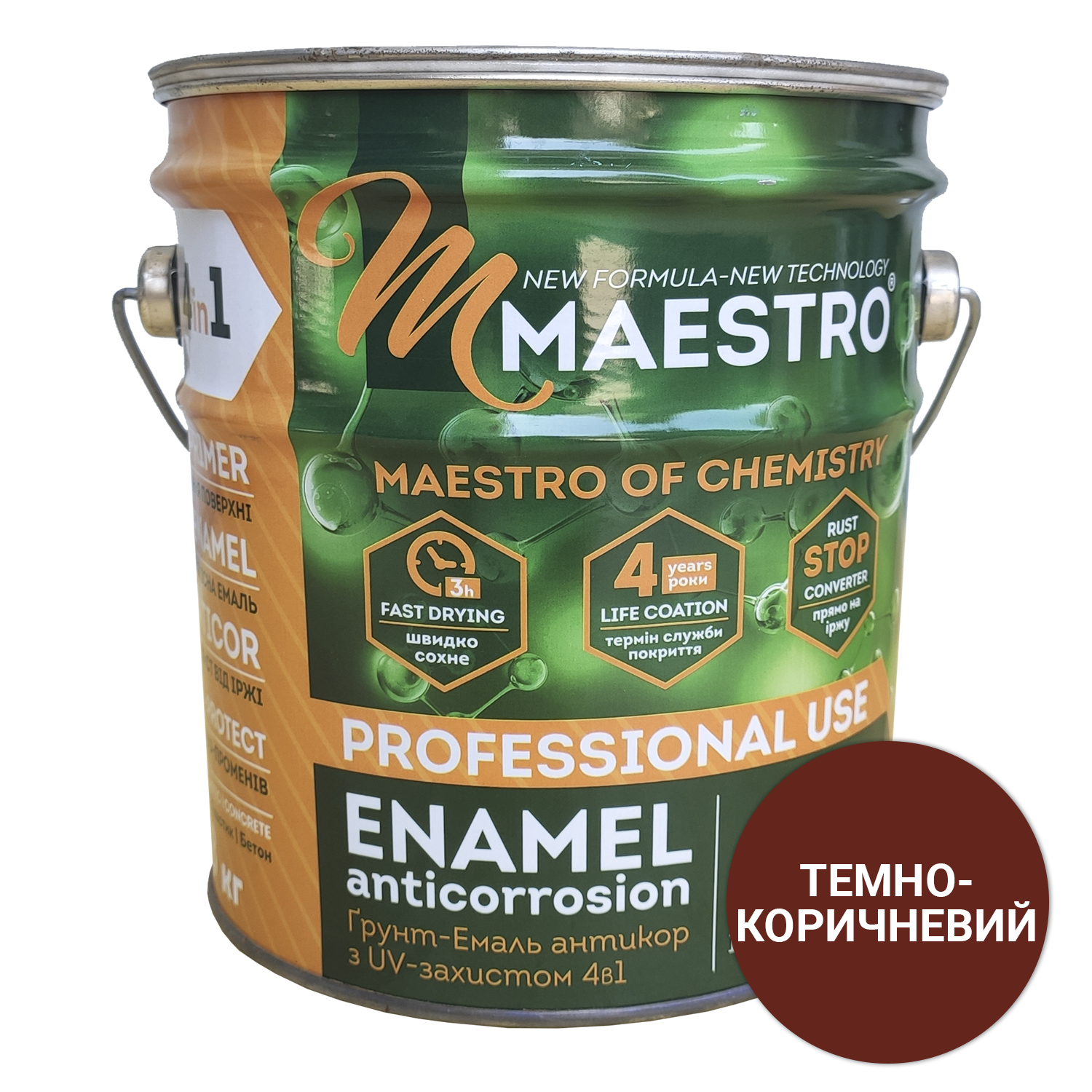 Ґрунт-емаль «Maestro» 4 в 1 - швидковисихаюча ґрунт-емаль по іржі, що об'єднує властивості ґрунту, антикорозійного покриття, декоративної емалі і захисного лаку. Завдяки цьому значно скорочує час, який зазвичай потрібно для проведення кожної процедури окремо (видалення іржі, ґрунтування та фарбування).Володіє хорошим зчепленням з поверхнею, що фарбується навіть при нанесенні на іржу. Утворює міцне покриття з довготривалим захистом від корозії, високими декоративними властивостями і стійкістю до механічних і атмосферних впливів. Не вигорає під дією УФ-променів, не тріскається і не відшаровується, зберігає еластичність навіть при негативних температурах.