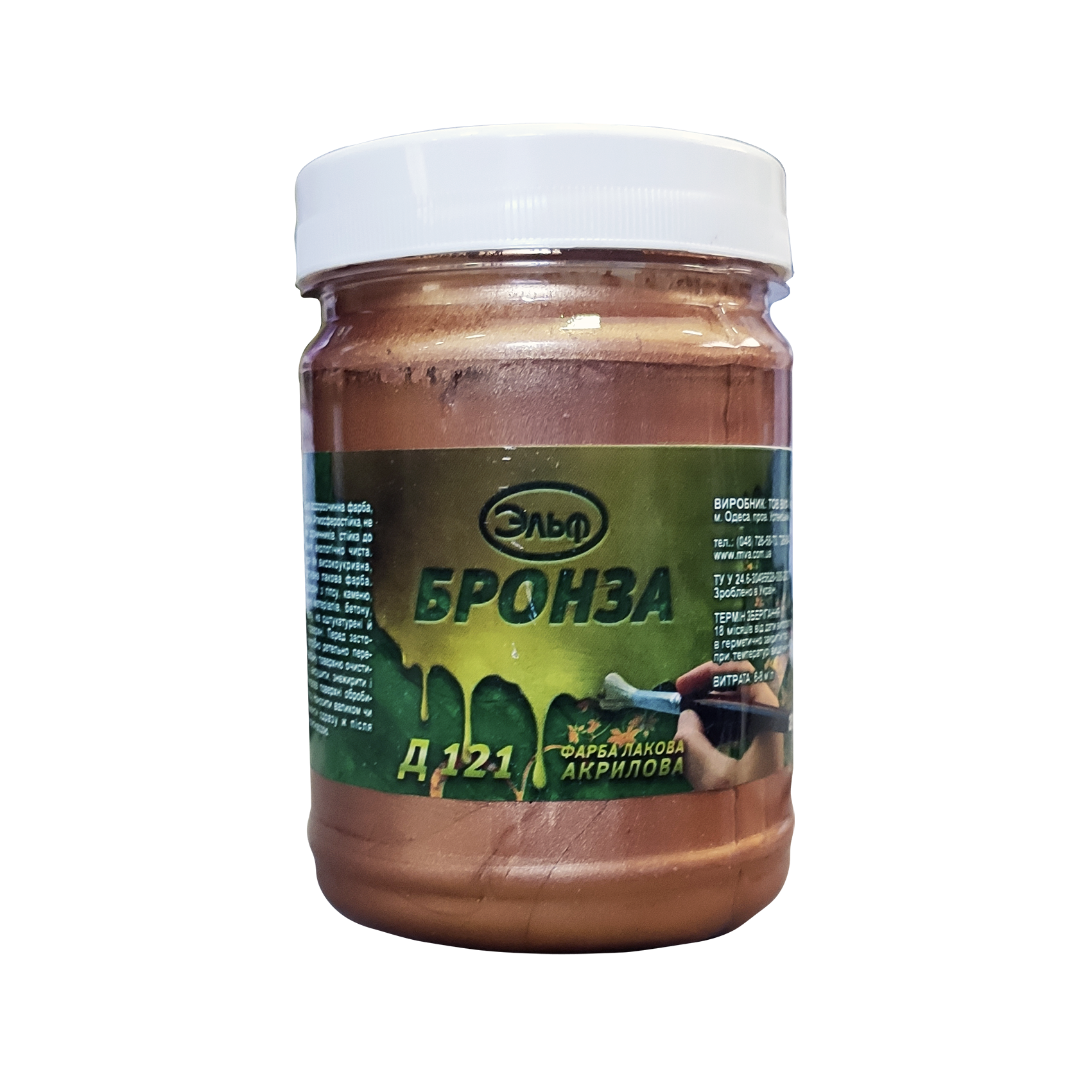 Ельф Д-121 - це універсальна водорозчинна фарба, що імітує кольори срібла, золота, міді, бронзи, перламутру, тощо. Використовується для внутрішніх та зовнішніх робіт як захисна і декоративна лакова фарба. Наноситься на поверхні з металу, гіпсу, каменю, дерева, деревних матеріалів, бетону, полістиролу, на оштукатурені і зашпакльовані поверхні.