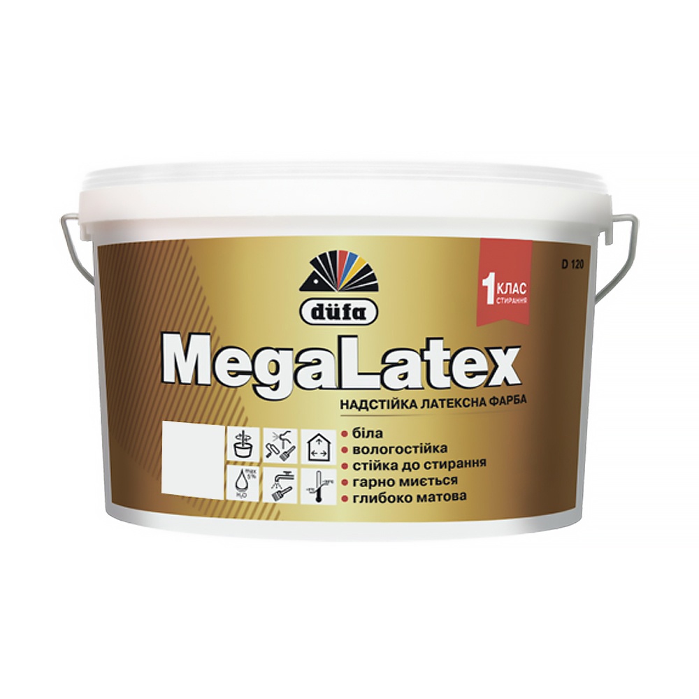 Düfa MegaLatex D120 – це надстійка латексна матова, стійка до миття та стирання фарба для стін і стель. Глибокоматова. Зручна в нанесенні, не бризкає з валика. Створює довговічне тонкошарове покриття.