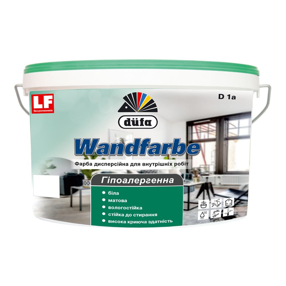 Düfa Wandfarbe D1a – це акрилова матова фарба для стін і стель. Утворює суконно-матове покриття, яке допускає легку вологу чистку та ремонтне перефарбовування.