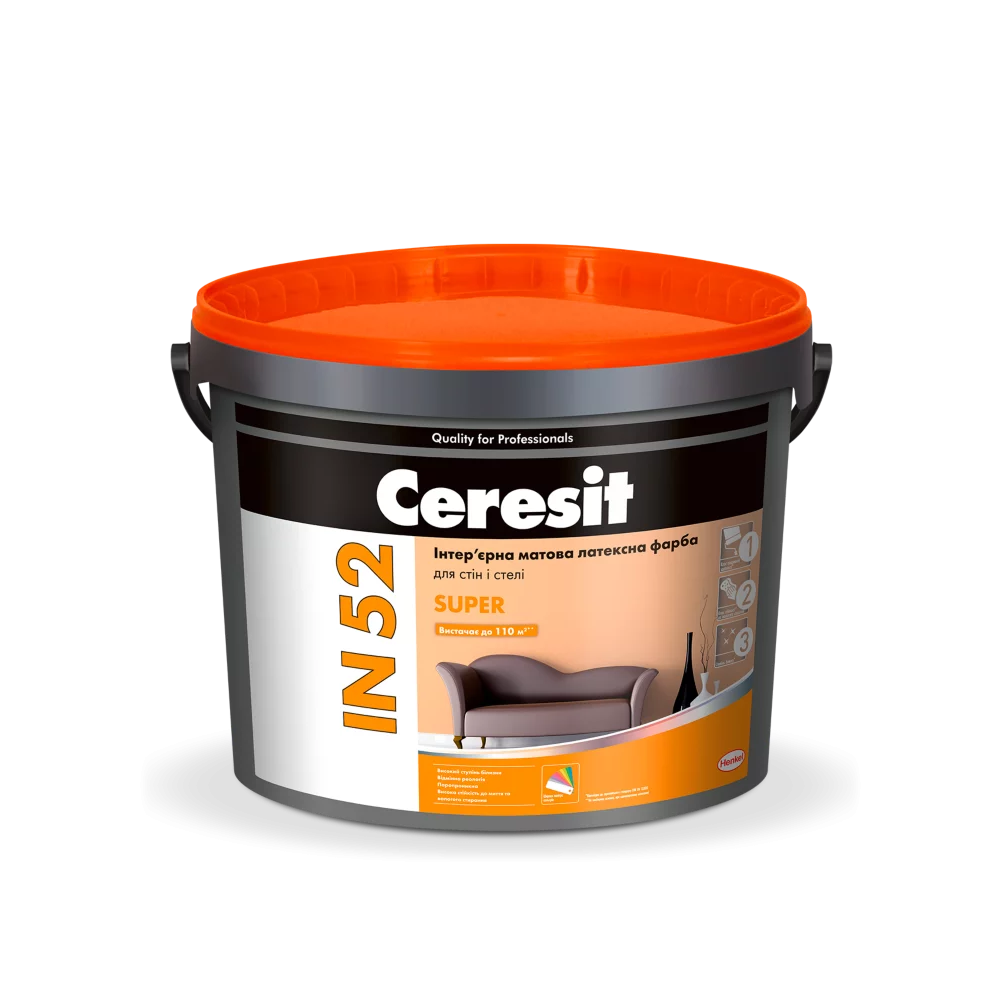 Ceresit IN 52 — латексна фарба для фарбування поверхонь будівельних конструкцій та елементів усередині будівель по мінеральних і органічних основах (шпалери, склохолст, фанера, ДСП і ДВП) в приміщеннях з нормальним експлуатаційним навантаженням. Допускається миття з використанням побутових миючих засобів. Можливе багатократне ремонтне перефарбування без видалення попереднього шару. Не застосовувати для підлоги. Для використання в будівлях медичного призначення та дитячих закладах.