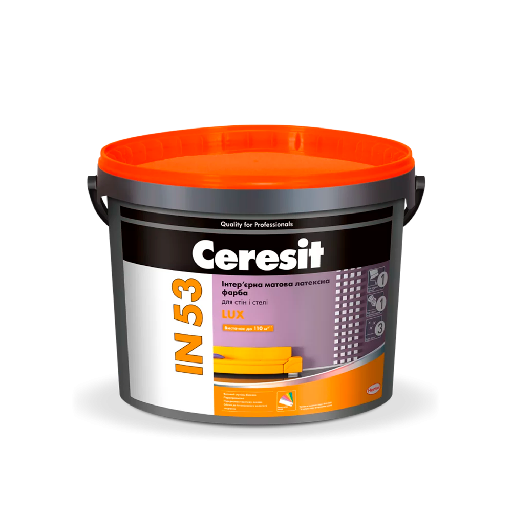 Ceresit IN 53 — інтер’єрна матова латексна фарба для поверхонь будівельних конструкцій та елементів усередині будівель по мінерал. і органічних основах (шпалери, склохолст, фанера, ДСП і ДВП), що несуть високе експлуатаційне навантаження та потребують частого миття з використанням побутових миючих і дезінфікуючих засобів. Для приміщень з підвищеною вологістю. Не застосовувати для підлоги. Для використання в будівлях медичного призначення та дитячих закладах.