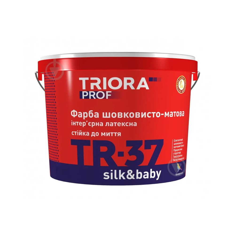 Акрилова шовковисто-матова інтер’єрна фарба. Створює елегантний помітно виражений блиск, гарно підкреслює структуру поверхні. Завдяки високому вмісту латексу (35%), фарба міцно утримує перший клас стійкості до стирання. А це означає, що поверхню, пофарбовану шовковисто-матовою фарбою, можна постійно мити та чистити. У приміщеннях з високою прохідністю (коридори, офіси, дитячі кімнати) фарба стає незамінним другом. У кухнях і ванних кімнатах, де найчастіше доводиться проводити вологе прибирання, Triora шовковисто-матова показує відмінний результат.