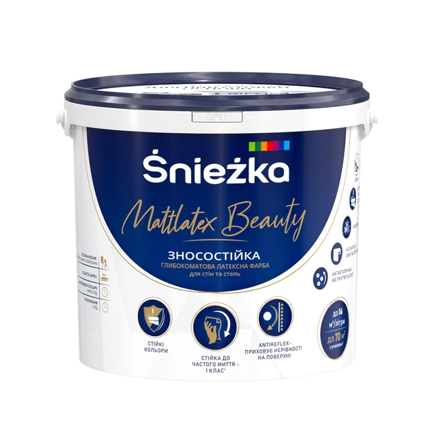 Sniezka Mattlatex Beauty - зносостійка латексна фарба, якій властива висока стійкість до частого миття та відміна покривна здатність. ANTIREFLEX - спеціальна формула, завдяки якій фарба приховує нерівності на поверхні та створює бездоганне глибокоматове покриття. Фарба виготовлена на базі високоякісної екологічно чистої сировини, і є безпечною для здоров'я та дозволяє стінам "дихати".