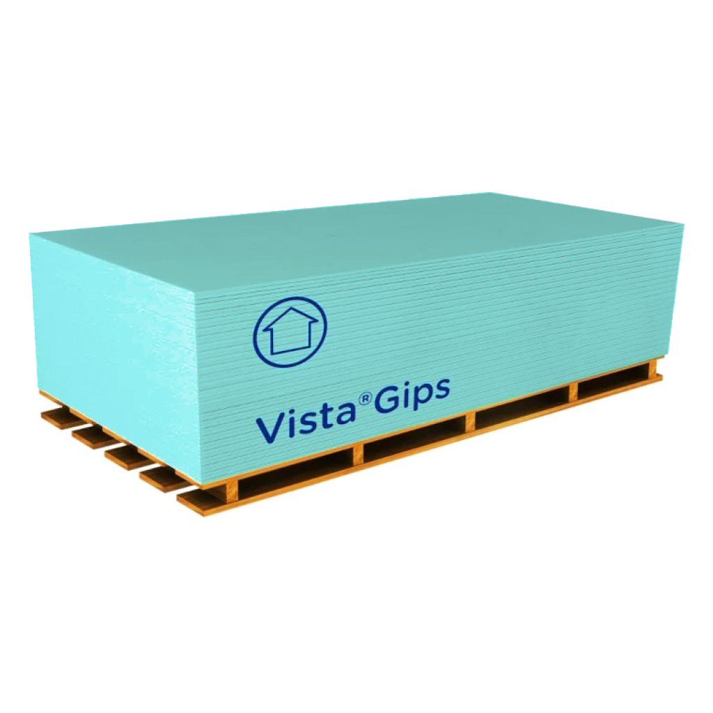 Гіпсокартон VistaGips - це високоякісний листовий матеріал, що виготовляється зі спеціального паперу та гіпсового сердечника з водовідштовхувальними (гідрофобними) добавками для захисту від вологи. Використовується для виконання стін і стель у вологих приміщеннях (ванних кімнатах, кухнях, пральнях, туалетах та інших).