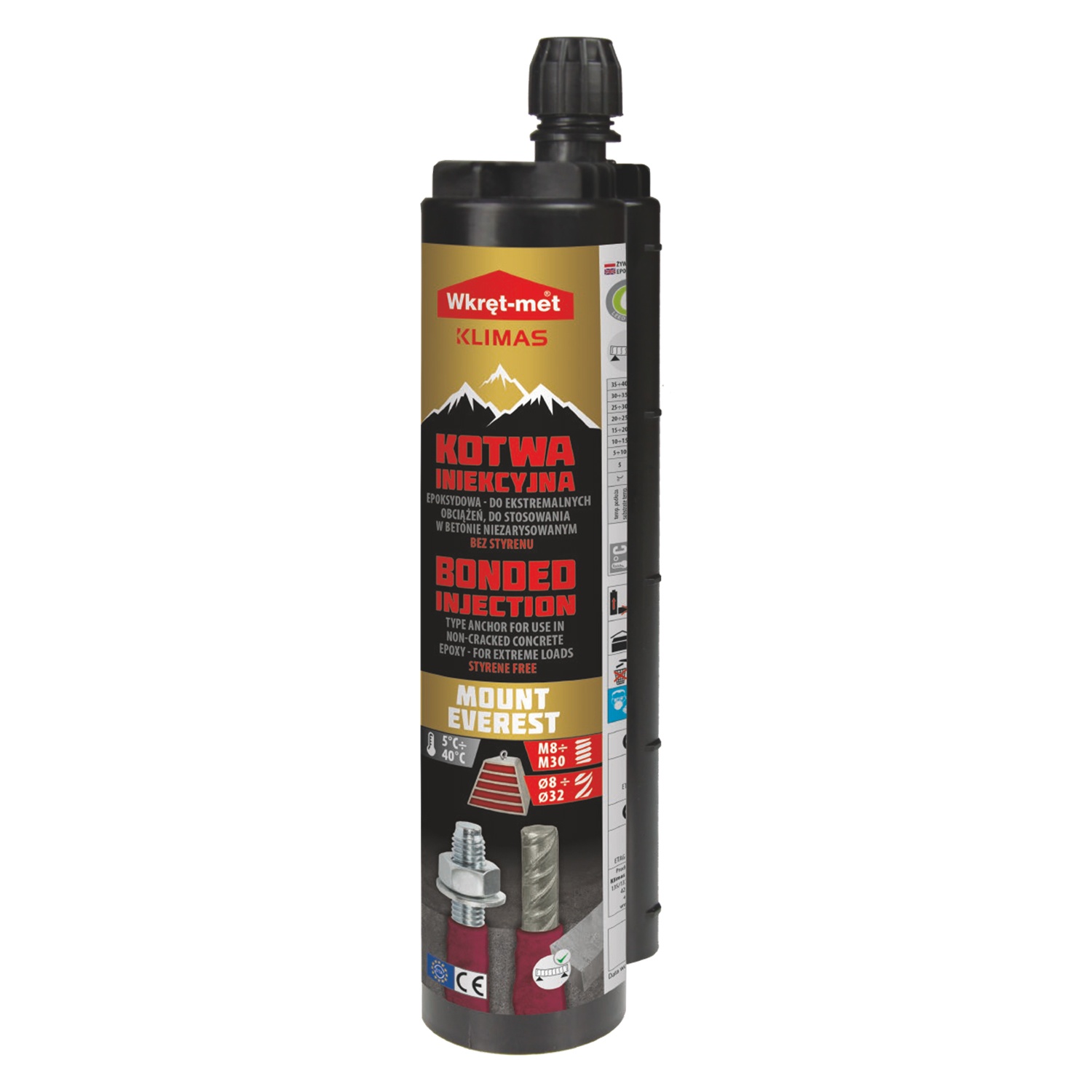 Епоксидний, двокомпонентний ін'єкційний анкер Wkret-met Mount Everest призначений для професійного використання в самих надійних і міцних з'єднаннях. Використовуються разом з арматурним стрижнем або різьбовою шпилькою різного виду сталі, у бетоні. Завдяки новим хімічним формулам можливе кріплення у отворах заповнених водою. Робочі діапазони температури роблять вироби стійкими до зміни погодніх умов. Для зручності, додається запасний змішувач.