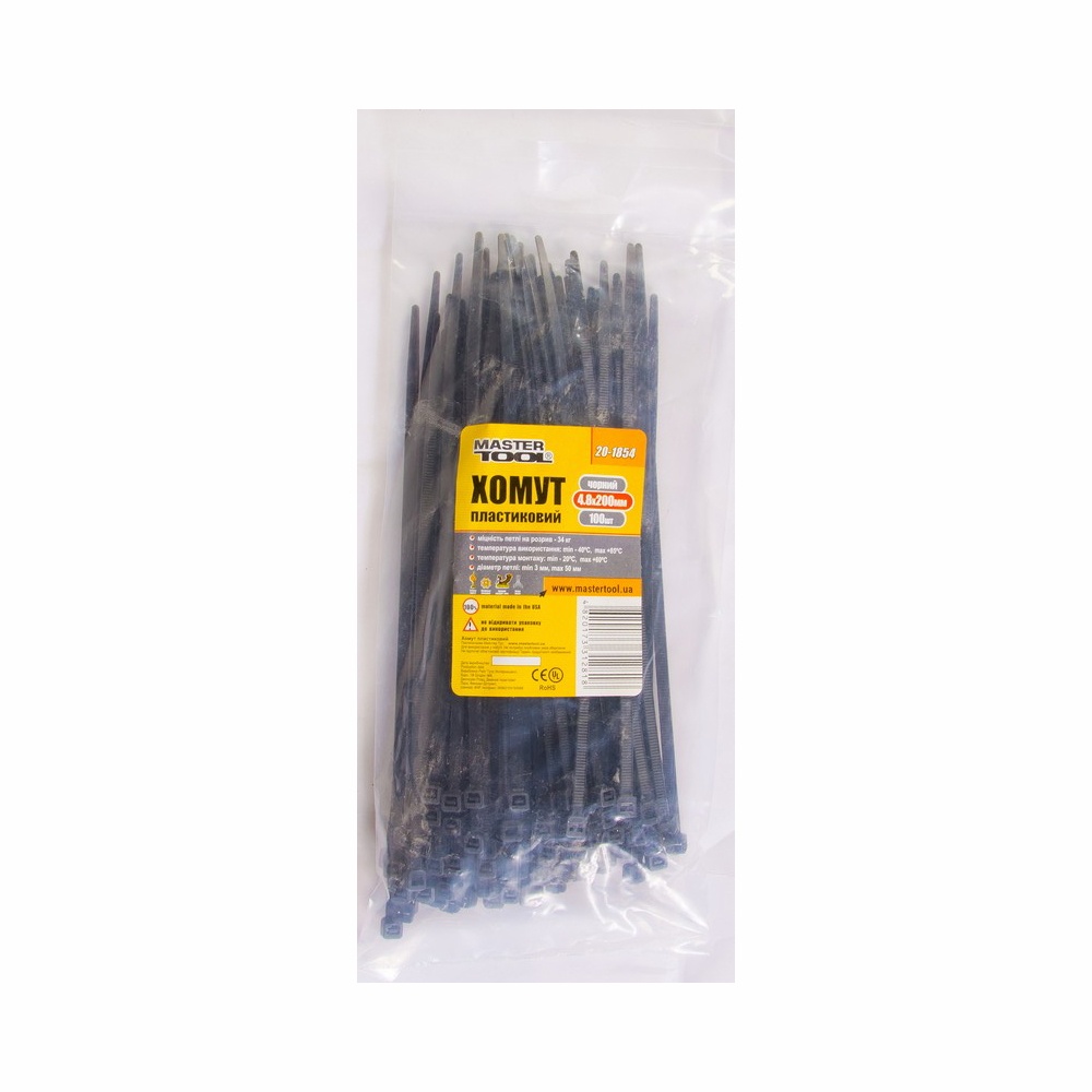 Пластиковий хомут чорного кольору. Застосовується для стяжки мережевих і/або електричних кабелів, шнурів, тросів, тощо. Підходить для кріплення декорацій, фіксація ковпаків автомобільних коліс, натяг рекламних тентів.