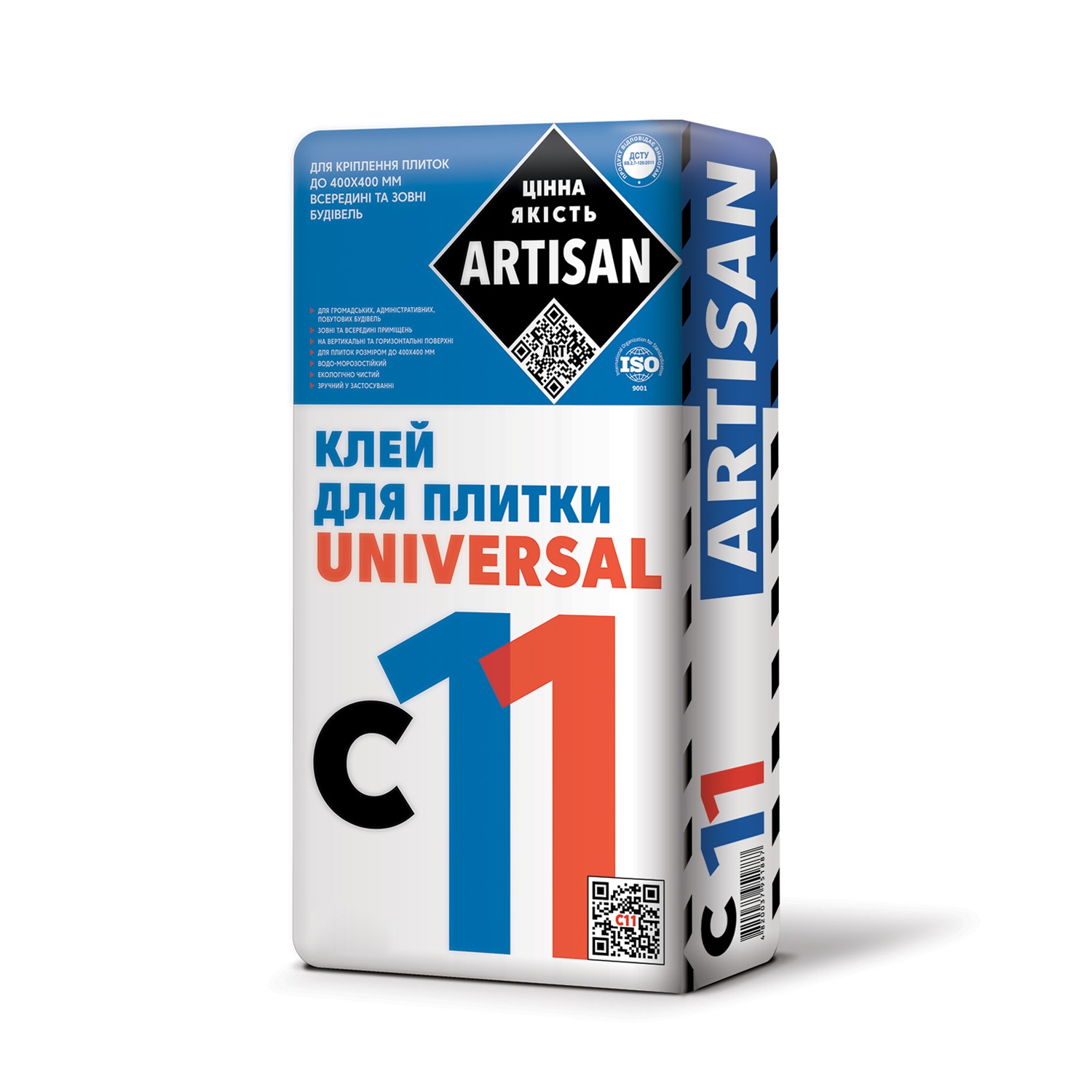 Клей для плитки Artisan C-11 Універсал призначений для кріплення керамічних, бетонних, клінкерних плиток, а також плиток із штучного граніту розміром не більш ніж 400×400 мм та водопоглинанням не менше 1 % на стіни та підлогу зовні і всередині приміщень. Для облицювання міцних цегляних, цементно-піщаних, цементно-вапняних, бетонних та інших мінеральних поверхонь, що не піддаються деформаціям.