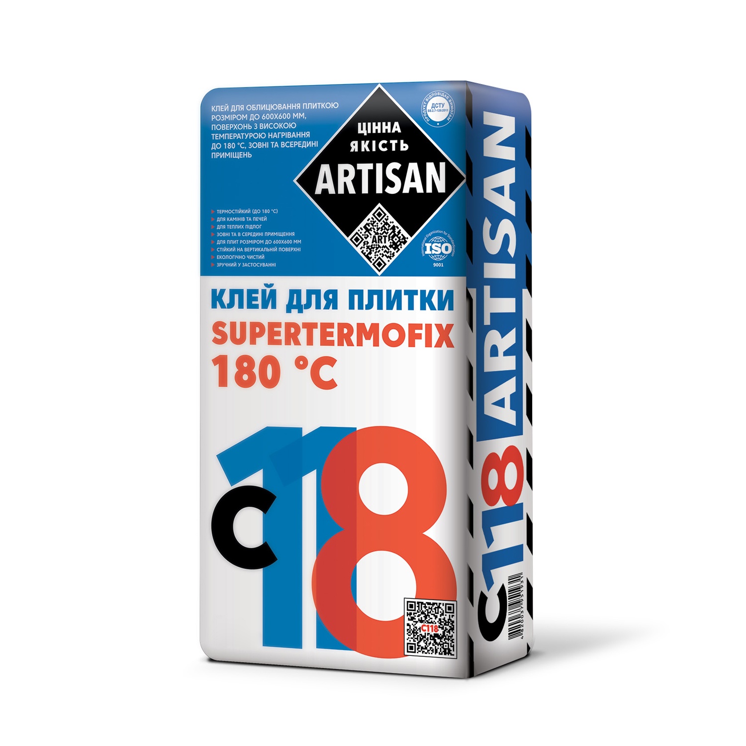 Клей для плитки Artisan C-18 Supertermofix - суміш, призначена для кріплення керамічних, бетонних, клінкерних плиток, а також плиток із штучного граніту, кахелю, мозаїки розміром не більш ніж 600×600 мм на стіни та підлогу з високою температурою нагрівання (до 180 °С) всередині та зовні приміщень. Для міцних цегляних, цементно-піщаних, цементно-вапняних, бетонних та інших мінеральних поверхонь, особливо рекомендується при облицюванні камінів, печей, теплих підлог (водяних та електричних).