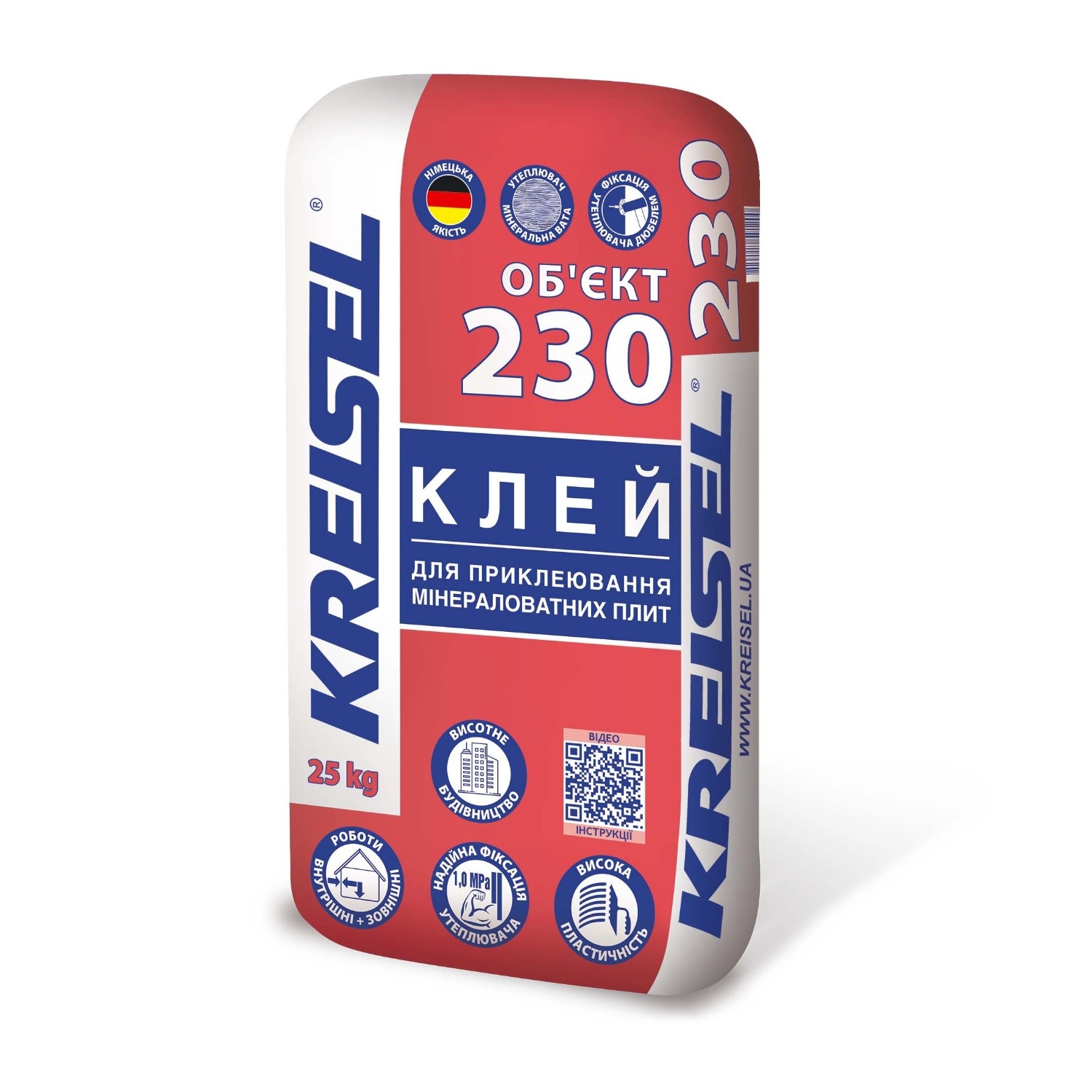 Суха суміш Kreisel Mineralwolle-Klebemörtel 230 призначена для приклеювання мінераловатних термоізоляційних плит до зовнішніх стін будинків та споруд, утеплених системами ТМ Kreisel. Після змішування з водою утворює однорідну клейову масу сірого кольору. Після затвердіння характеризується водо- та морозостійкістю, високою адгезією до основи та до мінераловатних плит.