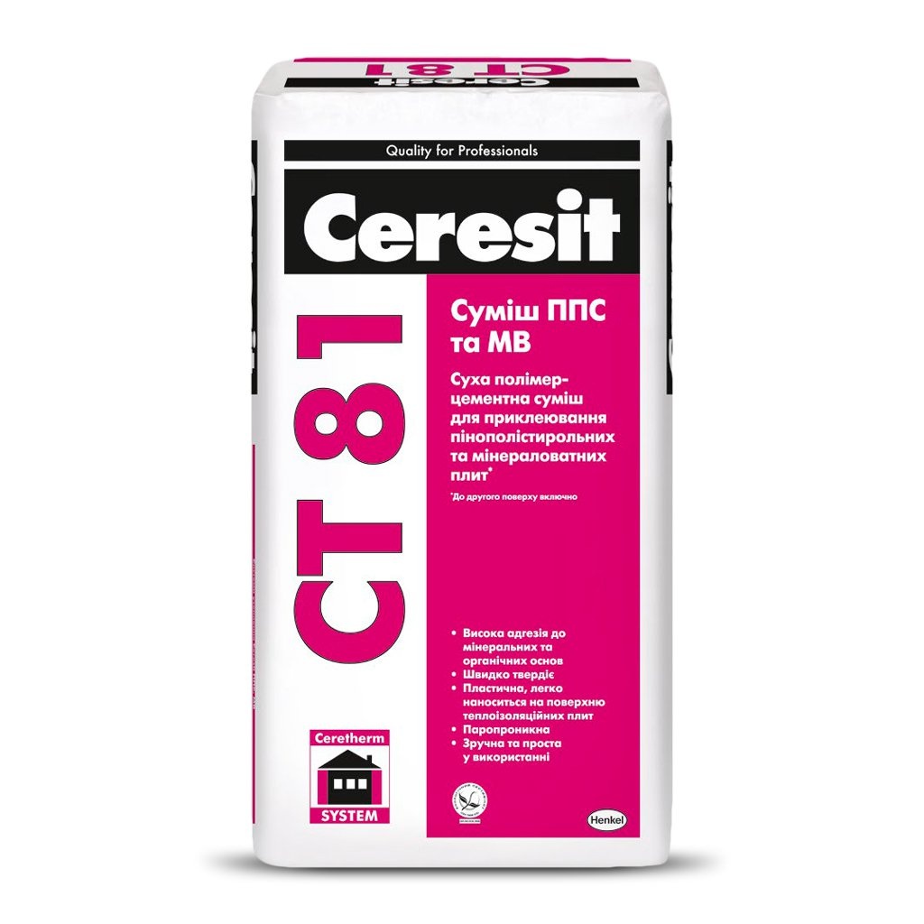 Суха суміш Ceresit CT 81 призначена для приклеювання пінополістирольних та мінераловатних плит при утепленні фасадів будівель і споруд.