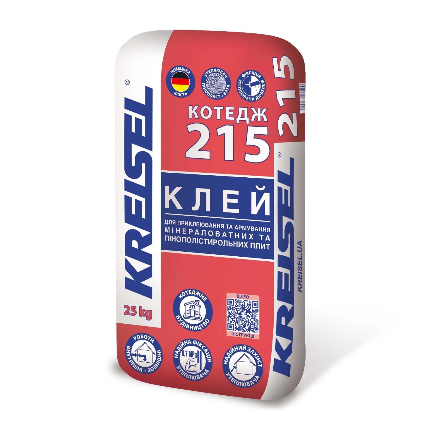 Суха суміш Kreisel Cottage 215 призначена для приклеювання та виконання базового армуючого шару з пінополістирольних плит, а також приклеювання мінераловатних плит під час утеплення фасадів. Після змішування з водою утворює однорідну клейову масу сірого кольору. Після затвердіння характеризується водо- та морозостійкістю, високою адгезією до основи та до теплоізоляційних плит.
